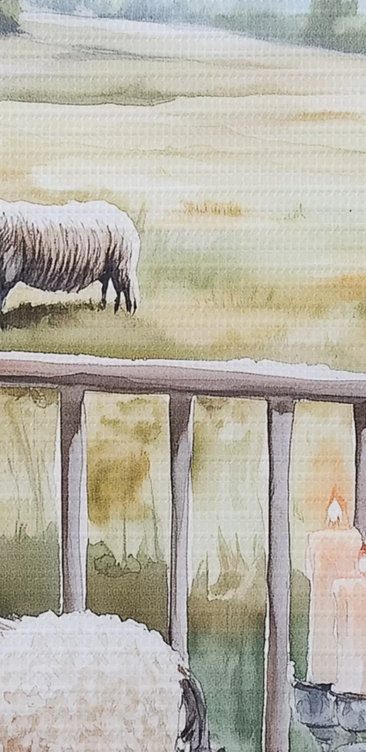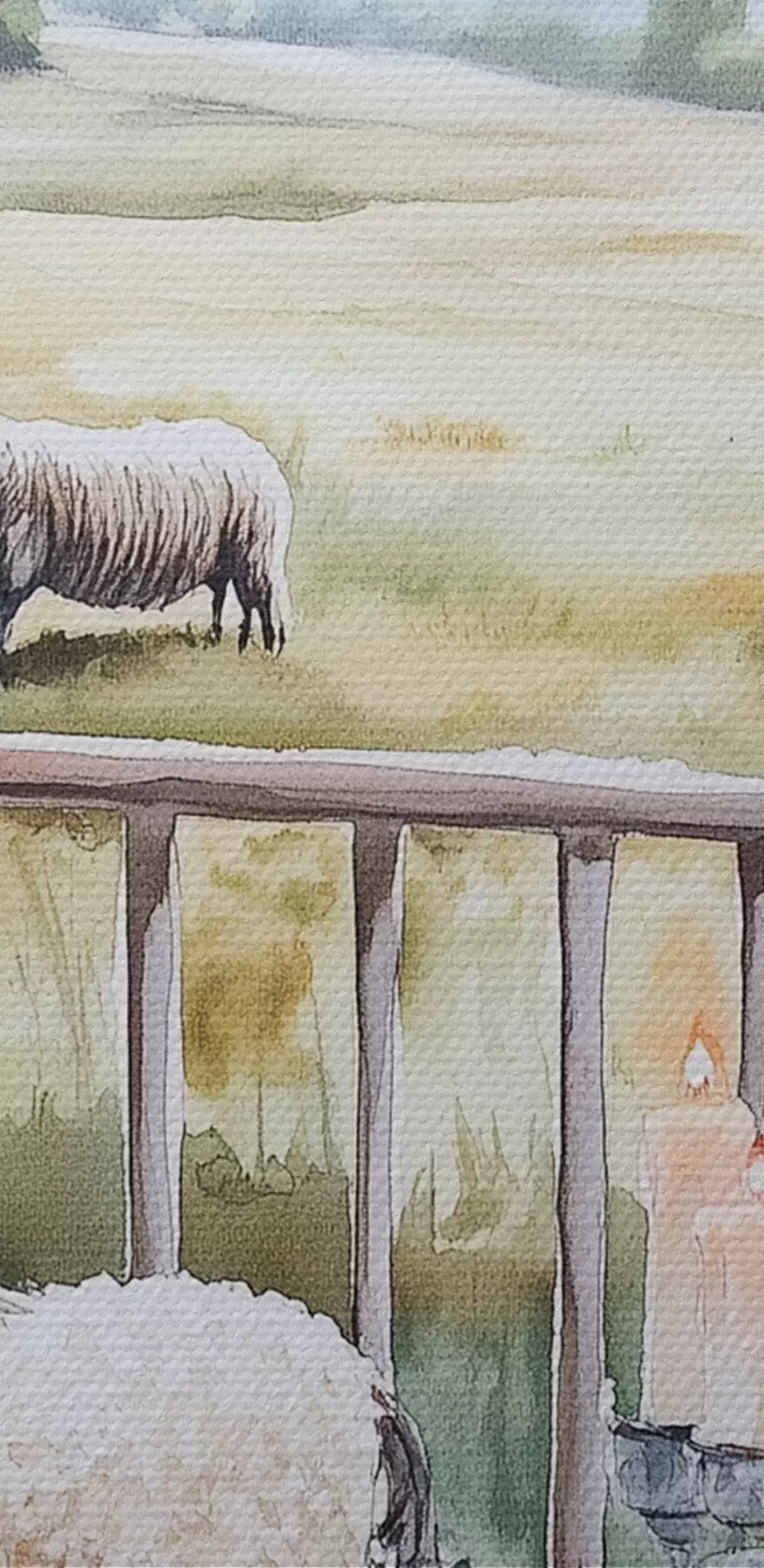 Obraz Wiejskie gospodarstwo z owcami, polami, rustykalnymi kwiatami, styl akwareli s44014