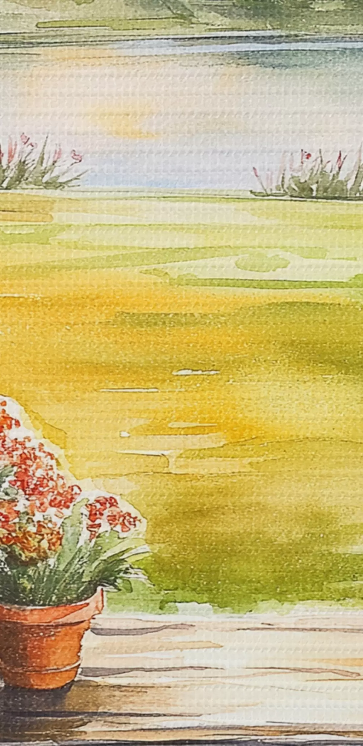 Obraz Wieś o zachodzie słońca, rustykalny, letnie kwiaty, jezioro, styl akwareli s44016