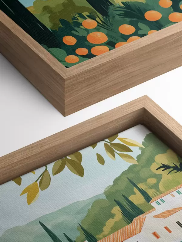 Obraz Śródziemnomorskie krajobrazy z drzewami pomarańczowymi i domami, wybrzeże morskie Nr s44027