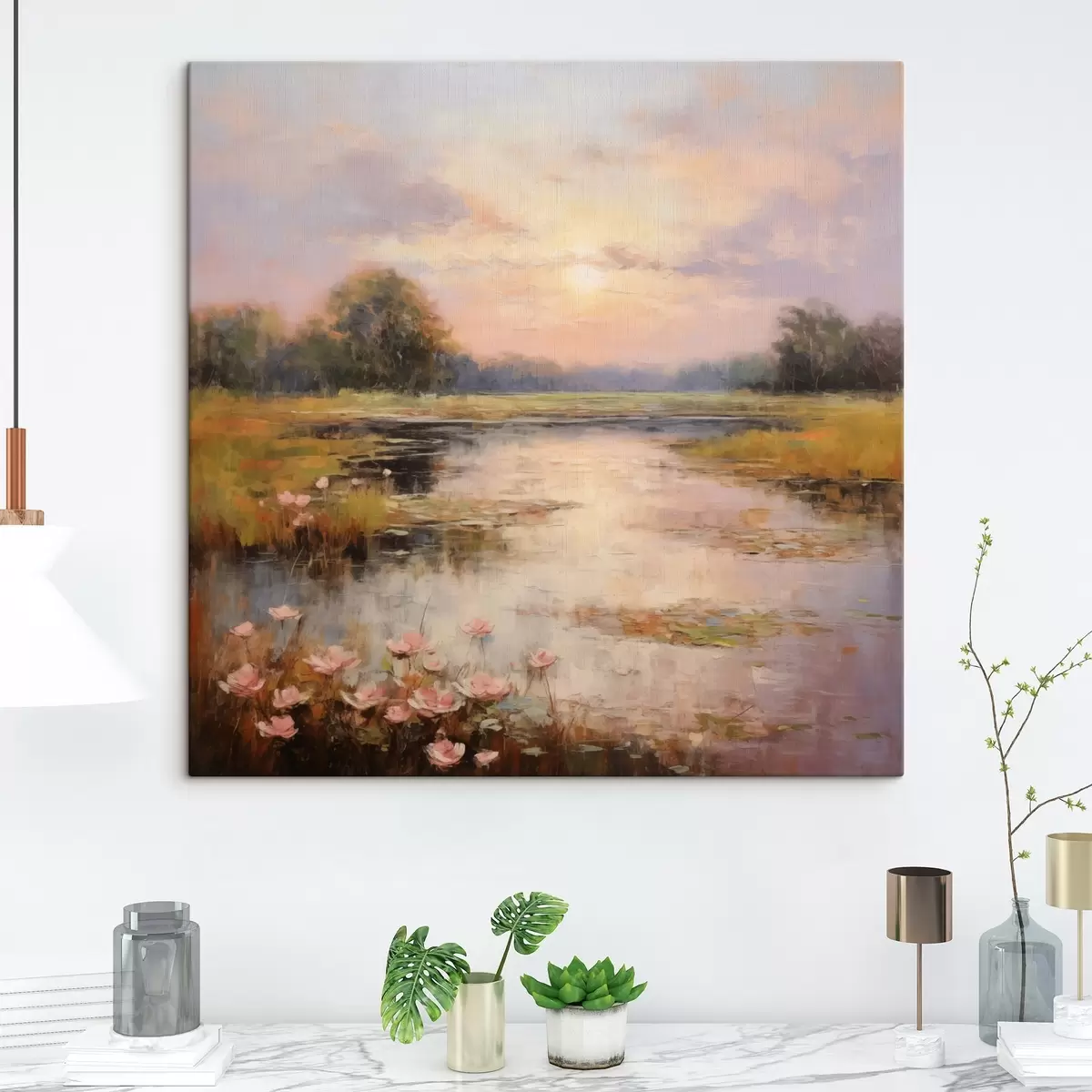 Obraz Zbiornik wodny z kwiatami o zachodzie słońca Nr s44044