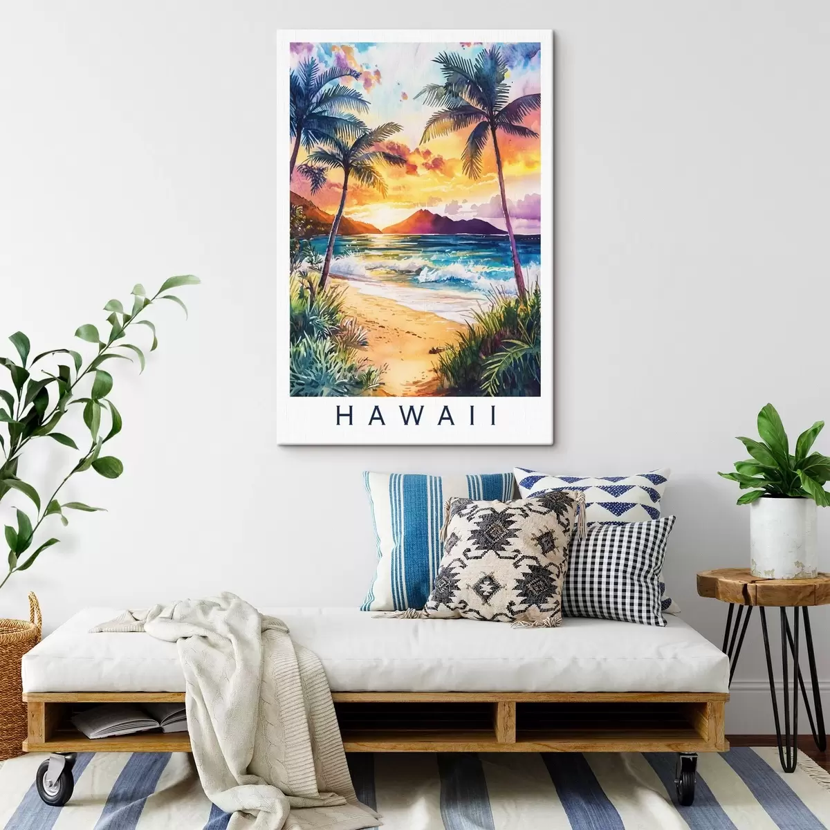 Obraz Zachód słońca na Hawajach, palmy, ocean, kolorowe niebo, styl akwareli Nr s44142