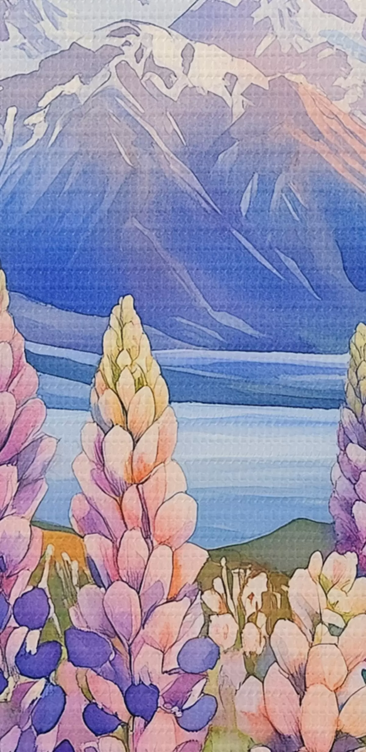 Obraz Kwiaty łubinu, łąka, góry, akwarela, niebo o zachodzie słońca s44146