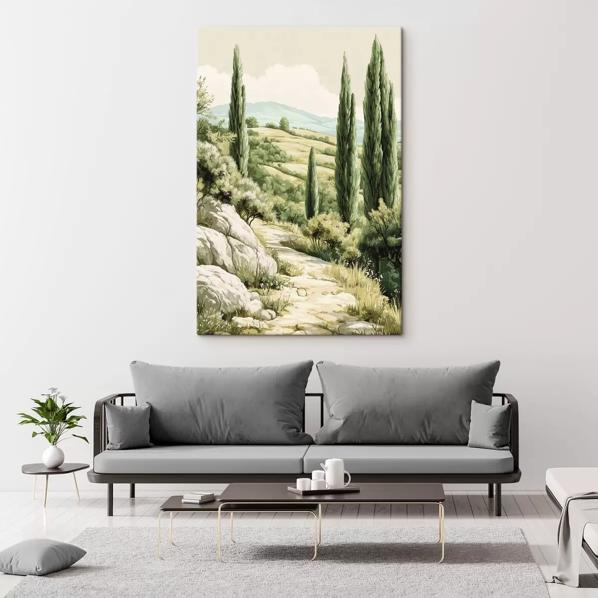 Obraz Letnie krajobrazy z cyprysami i zielonymi wzgórzami, styl rustykalny Nr s44308