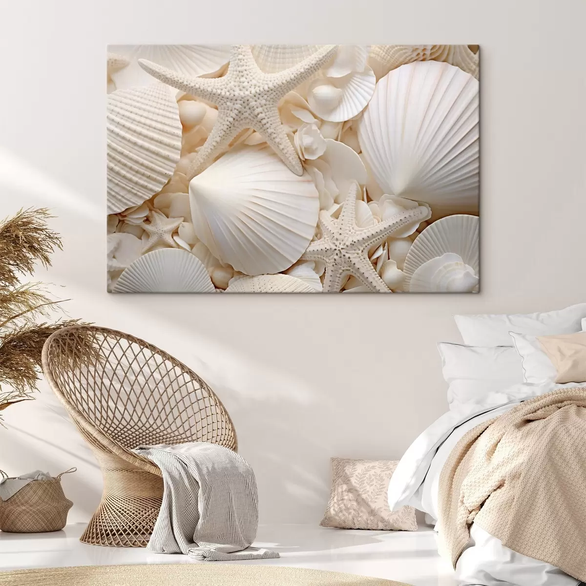 Obraz Dekoracyjne białe muszle i rozgwiazdy, tworzące teksturowaną monochromatyczną kompozycję Nr s44392