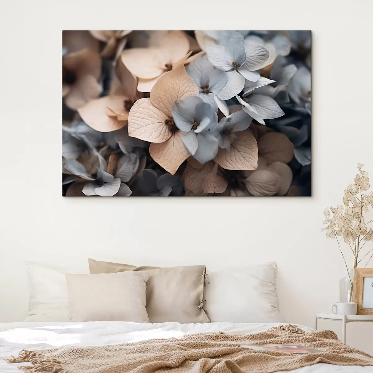 Obraz Kwiaty hortensji, jasnoniebieskie i beżowe płatki, ze szczegółowymi teksturami, elegancka kompozycja kwiatowa Nr s44394