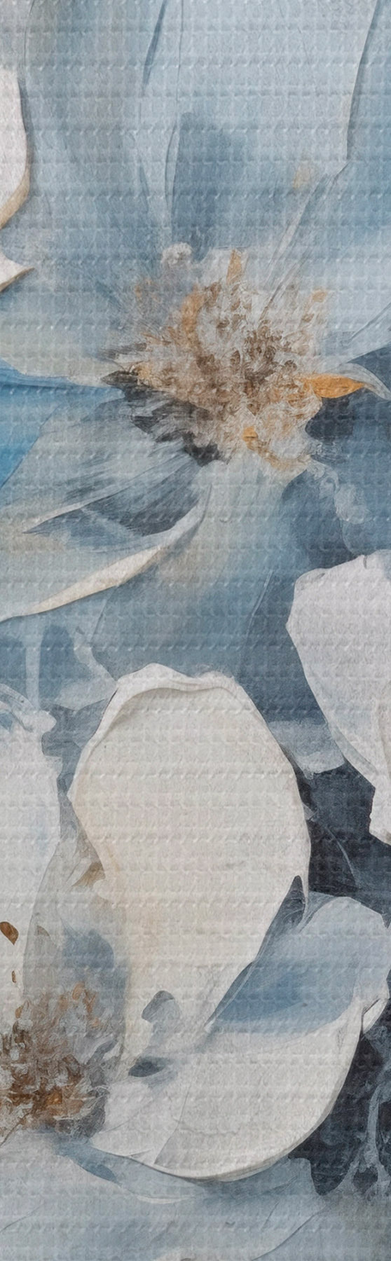 Obraz Białe kwiaty z niebieskimi liśćmi, na jasnobeżowym tle, z widocznymi pociągnięciami pędzla s44395