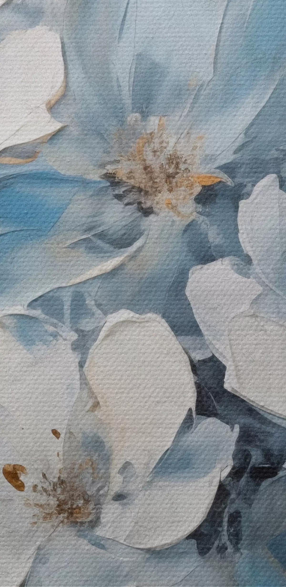 Obraz Białe kwiaty z niebieskimi liśćmi, na jasnobeżowym tle, z widocznymi pociągnięciami pędzla Nr s44395