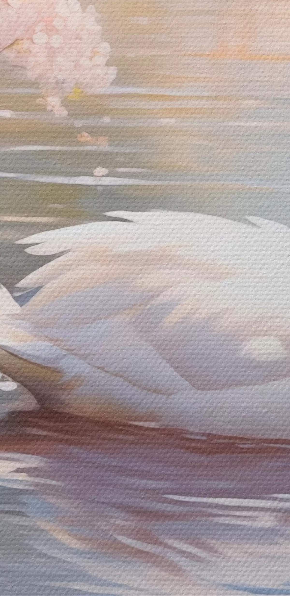 Obraz Biały łabędź pływający w jeziorze z drzewami kwitnącej wiśni, pastelowe kolory Nr s44396