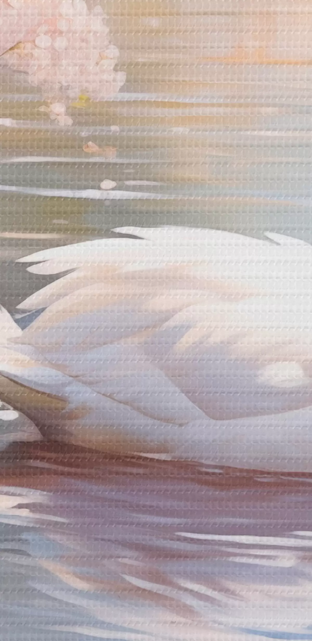 Obraz Biały łabędź pływający w jeziorze z drzewami kwitnącej wiśni, pastelowe kolory s44396