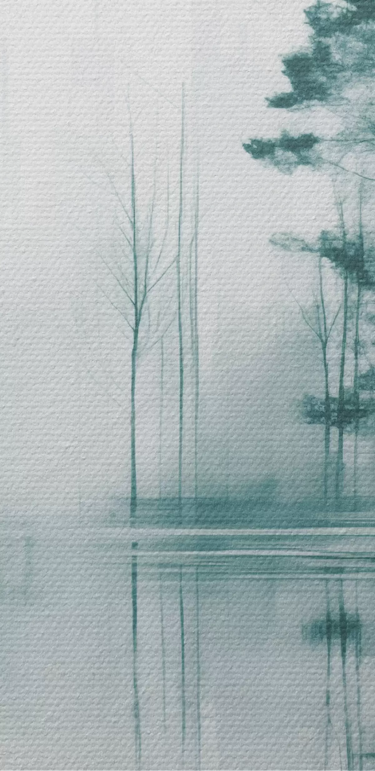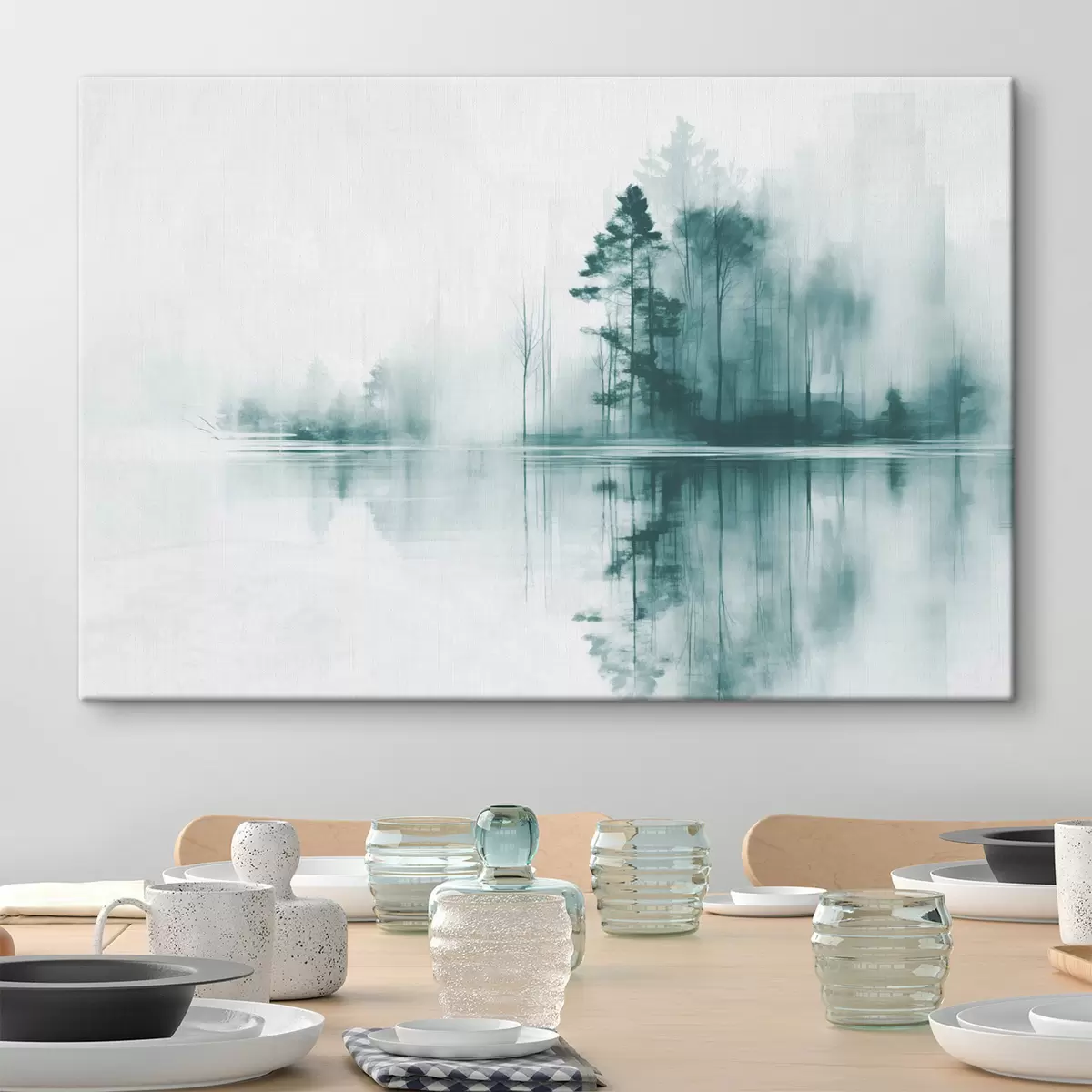 Obraz Abstrakcyjny las z wysokimi drzewami odbijającymi się w wodzie, stonowana paleta kolorów Nr s44403