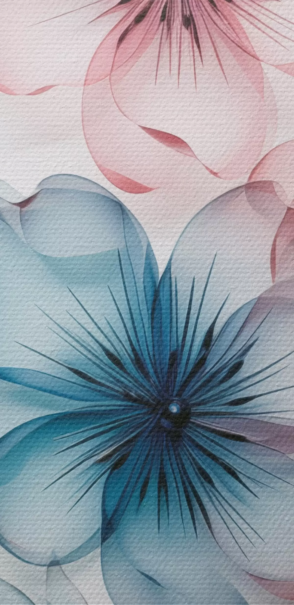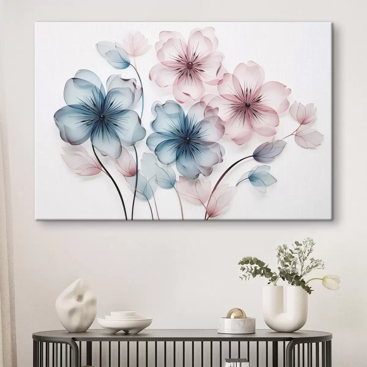 Obraz Przezroczyste, stonowane różowo-niebieskie kwiaty z widocznymi pręcikami i łodygami Nr s44405
