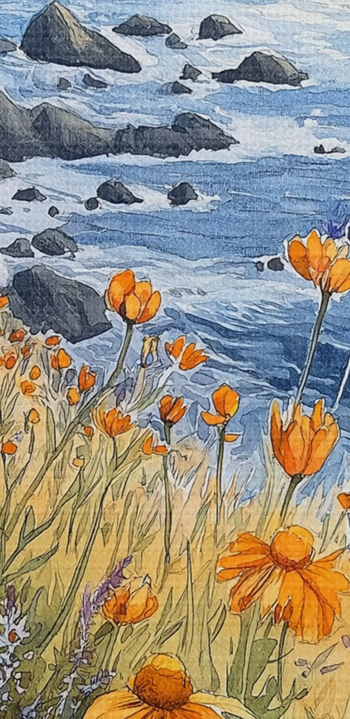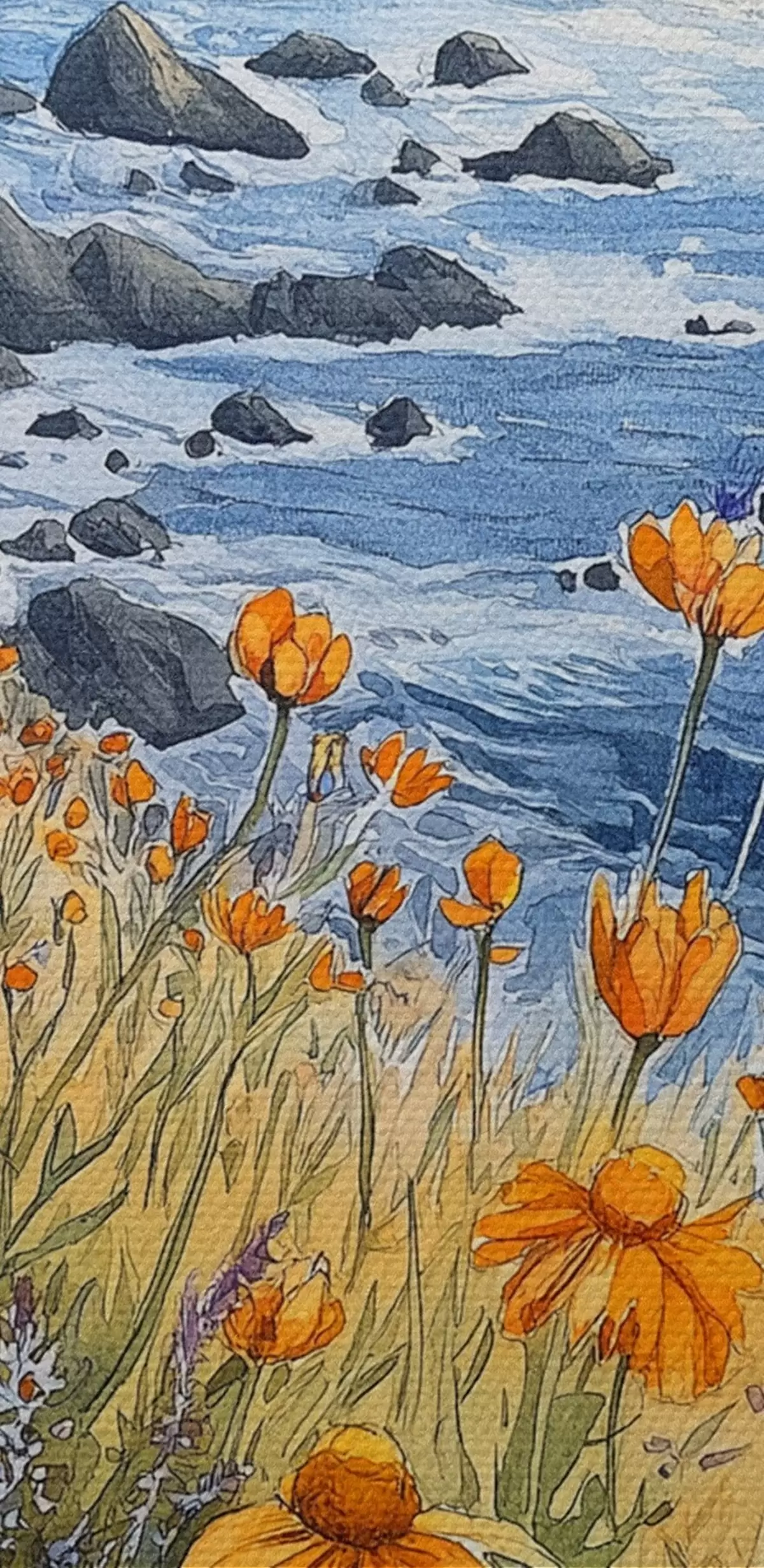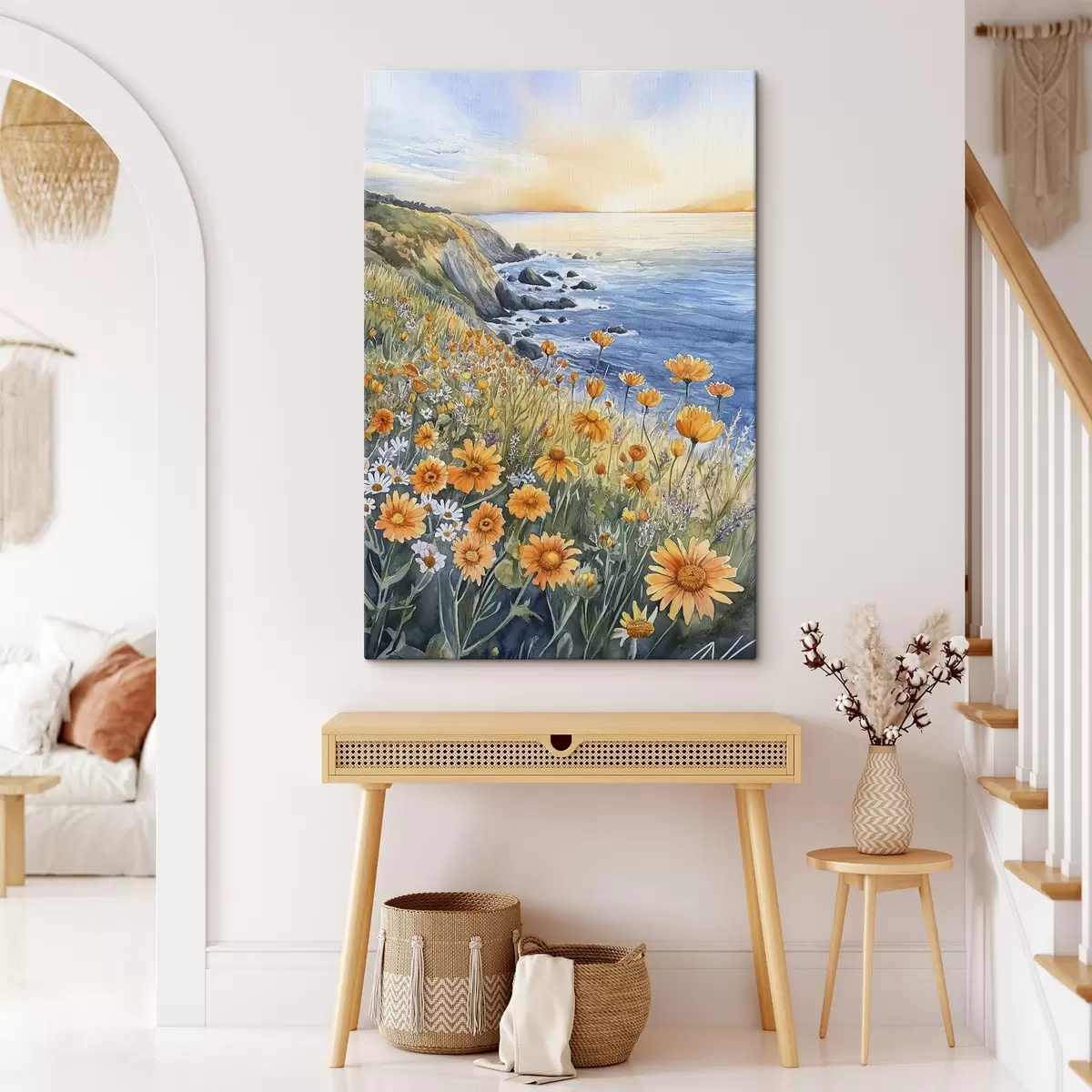 Obraz Klif z pomarańczowymi kwiatami, wybrzeże oceanu, Portugalia, styl akwareli Nr s44604