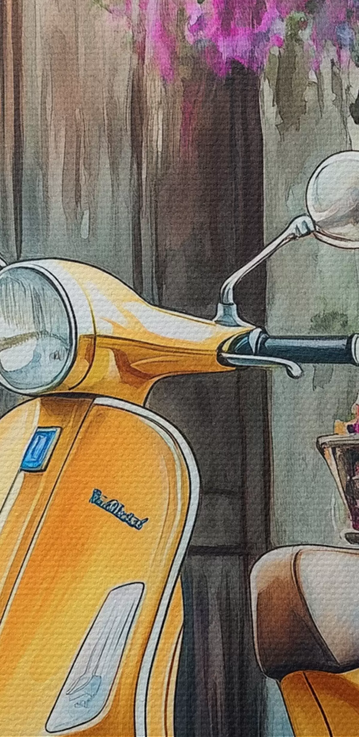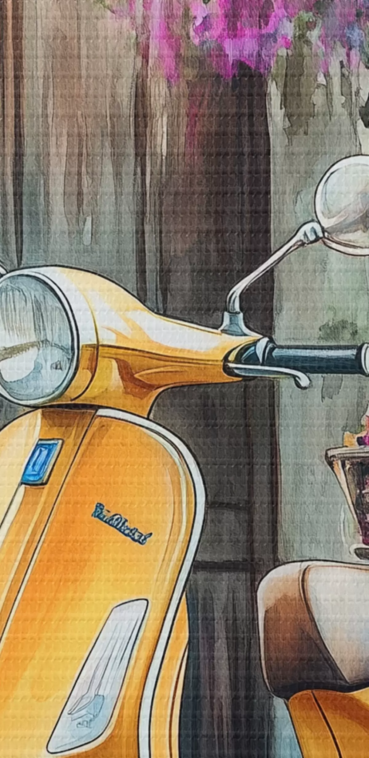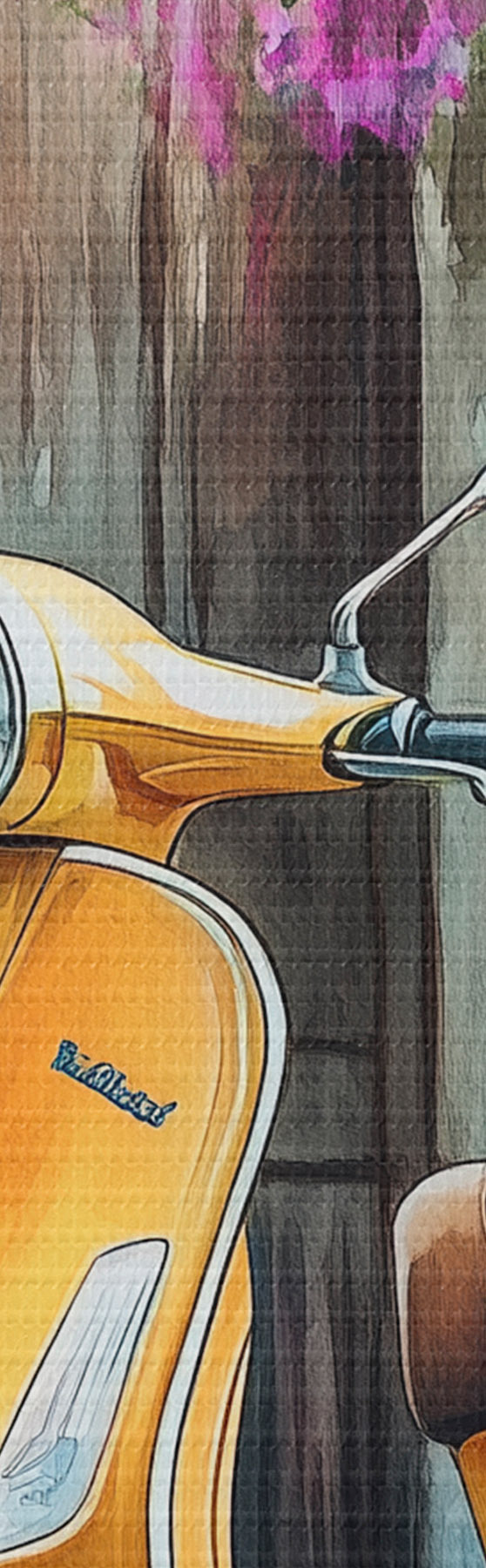 Obraz Żółty skuter Vespa w pobliżu drewnianych drzwi z kwiatami Nr s44607