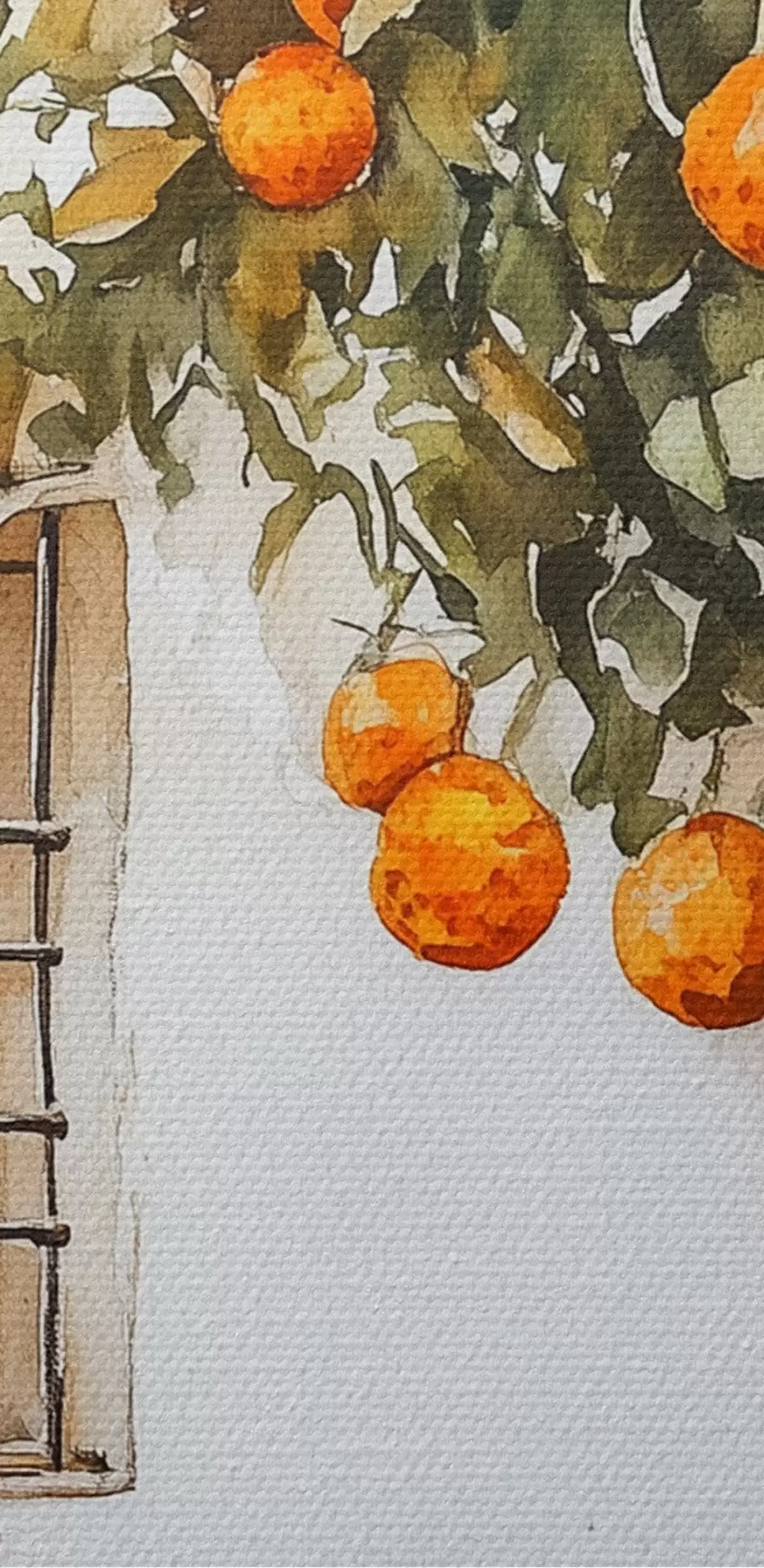 Obraz Śródziemnomorski biały dom z drzewem pomarańczowym i rowerem Nr s44610