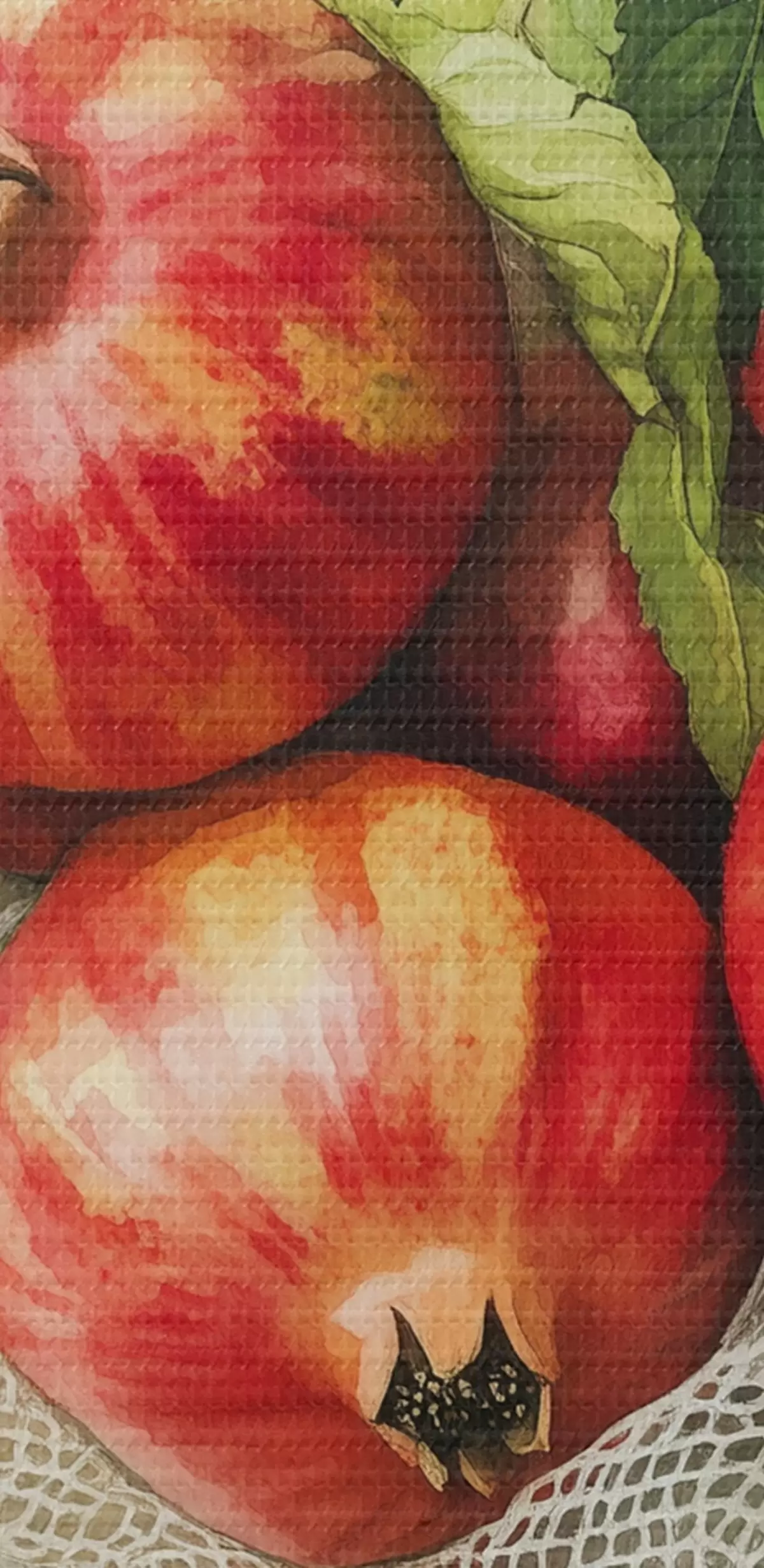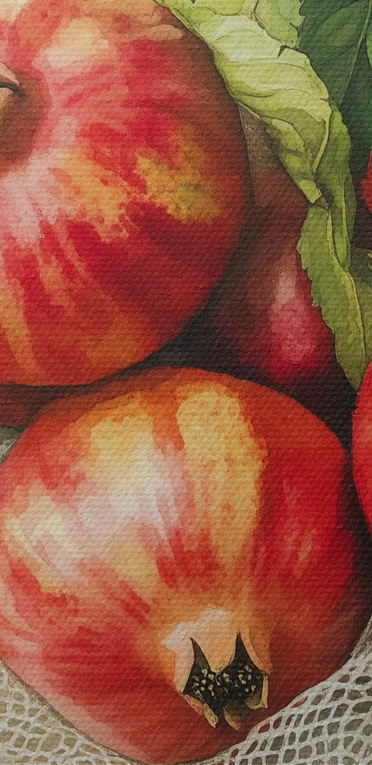 Obraz Granaty z listkami mięty na lnianych obrusach, styl rustykalny Nr s44611