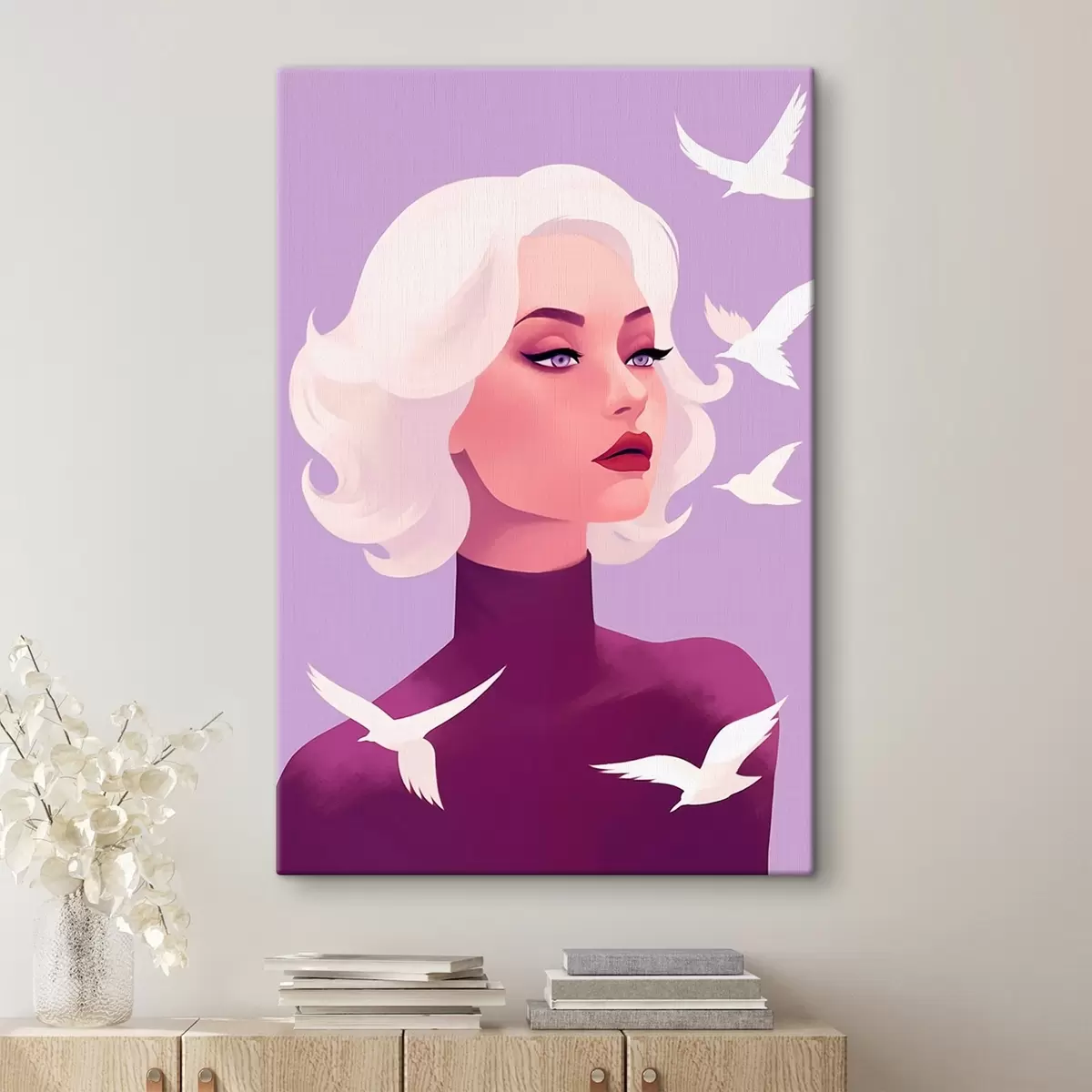 Obraz Portret kobiety z białymi włosami na tle ptaków Nr s44681