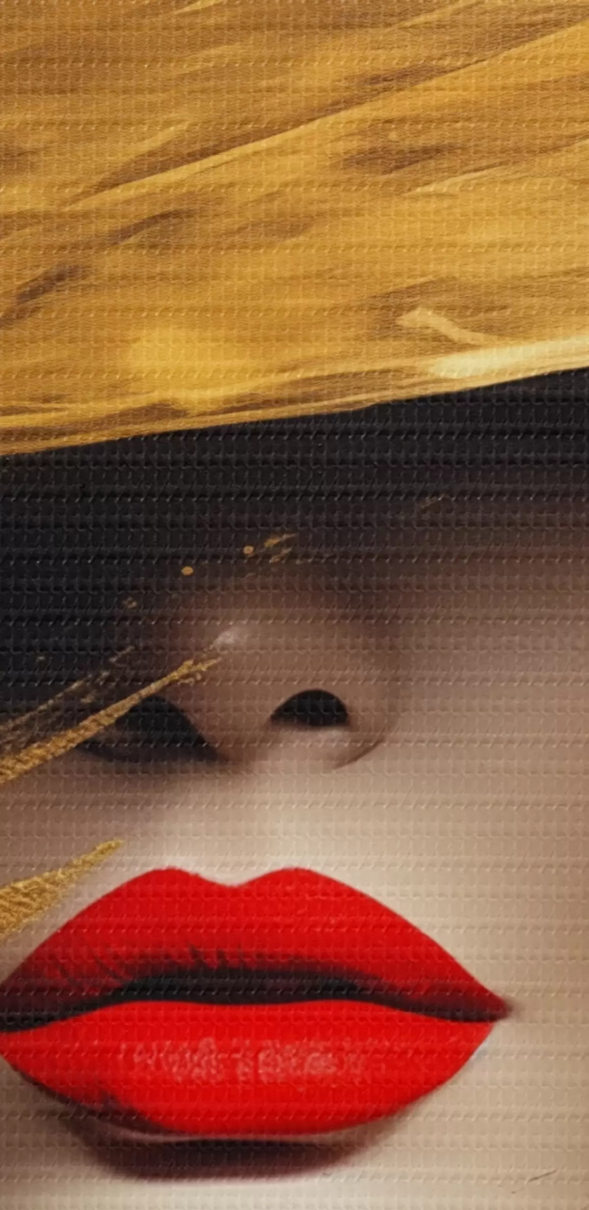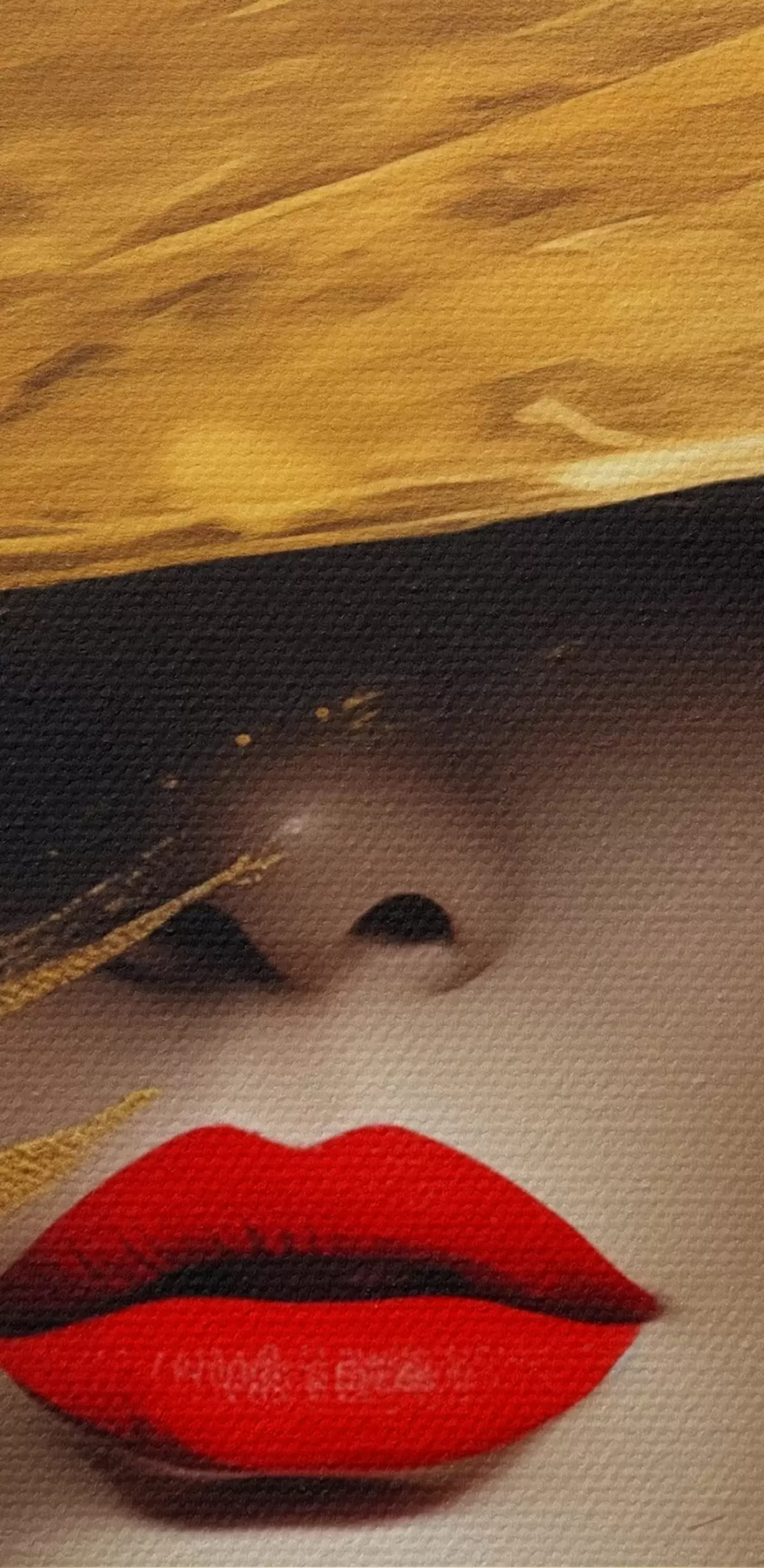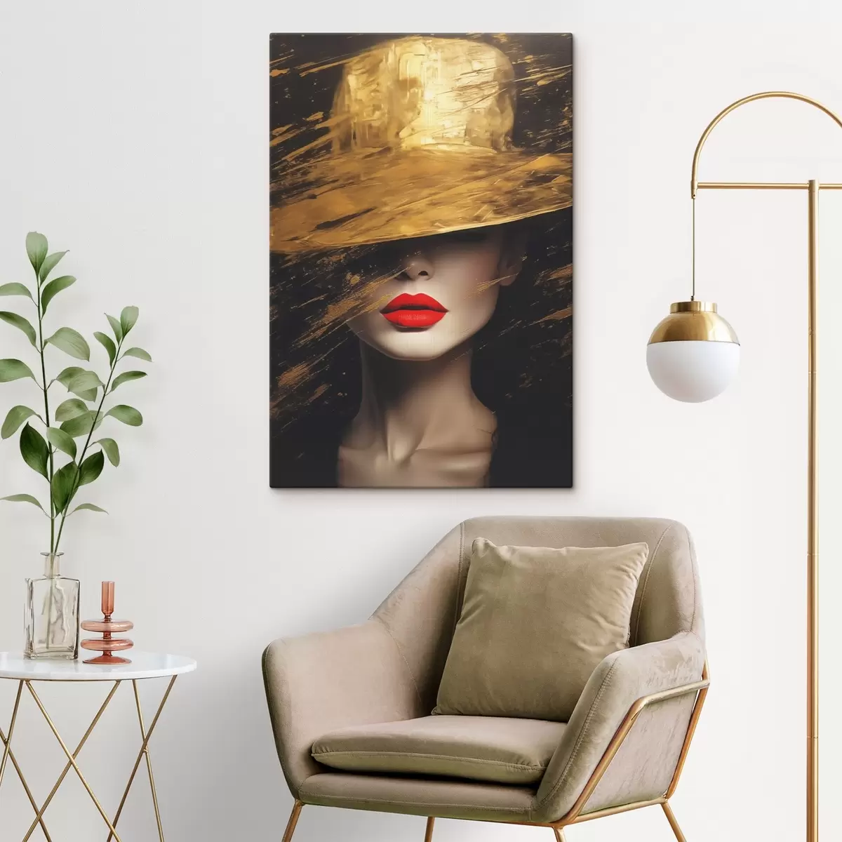 Obraz Kobieca twarz z czerwoną szminką pod szerokim kapeluszem Nr s44691