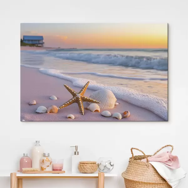 Obraz Wybrzeże morskie z rozgwiazdami, muszlami i falami Nr s44714