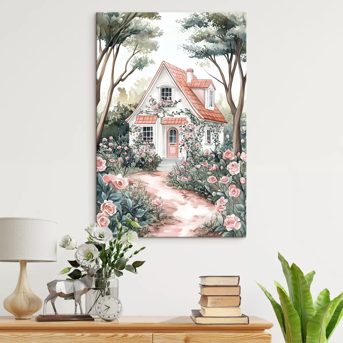 Obraz Biały dom z różanym ogrodem w lesie Nr s44716