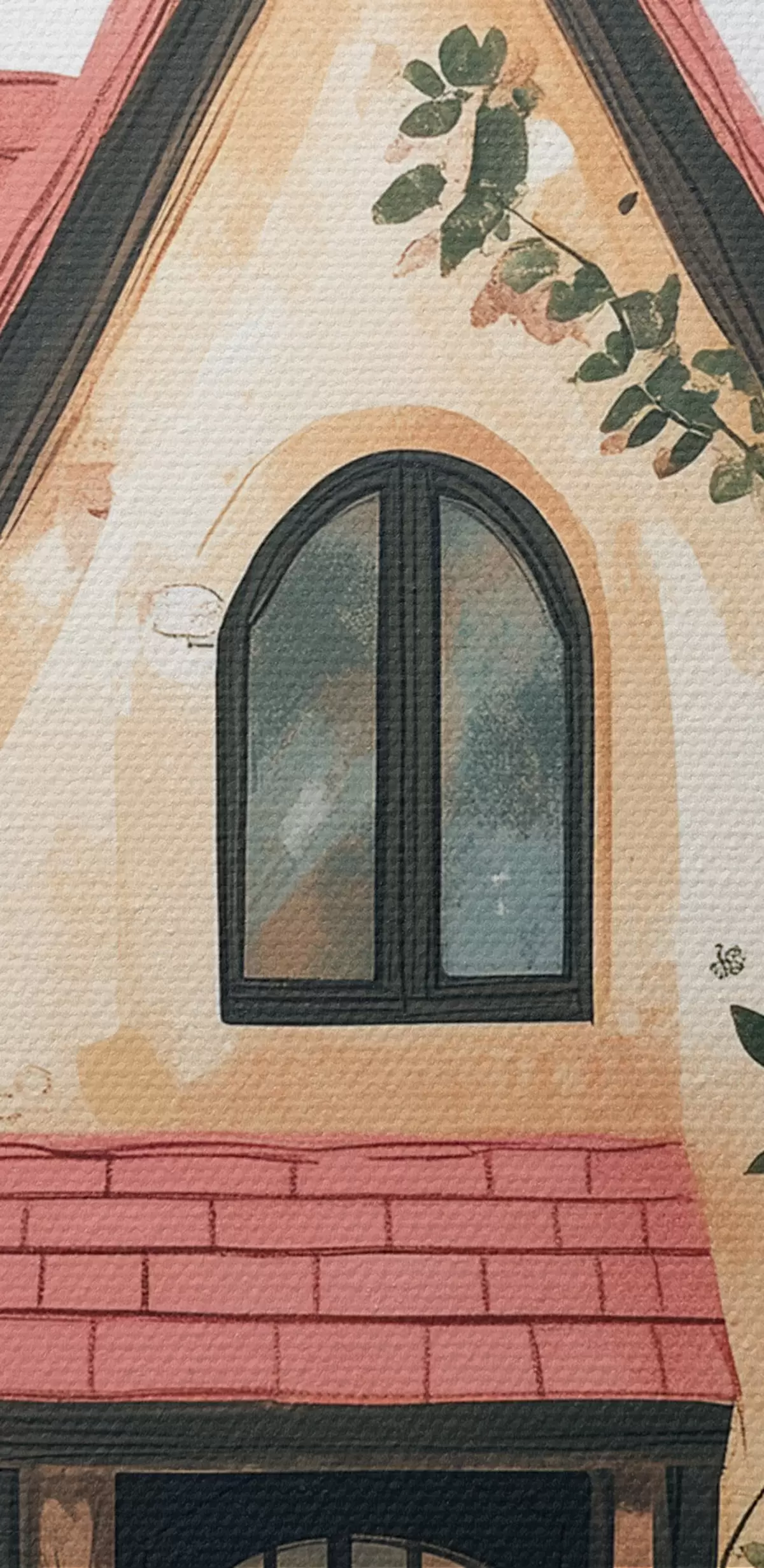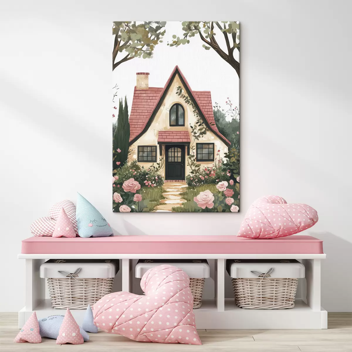 Obraz Bajkowy dom w lesie, róże, pastelowy styl Nr s44718
