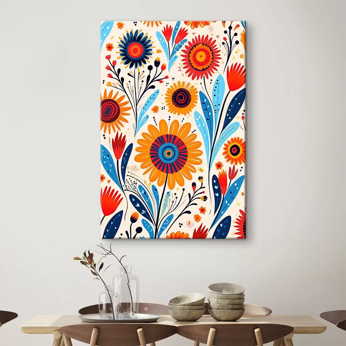 Obraz Stylizowane kwiaty w niebiesko-pomarańczowej kolorystyce Nr s44761
