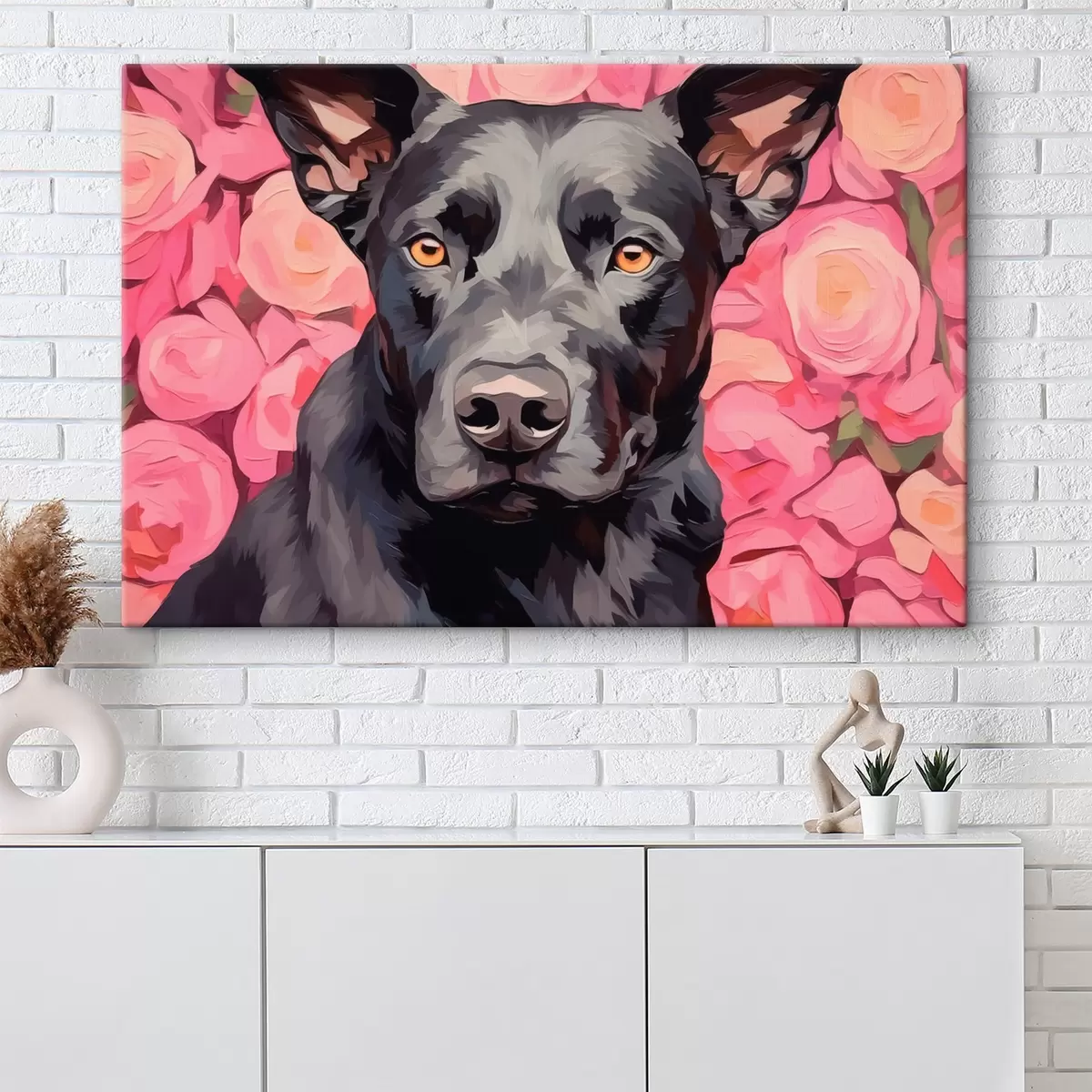 Obraz Czarny pies na abstrakcyjnym tle róż Nr s44817