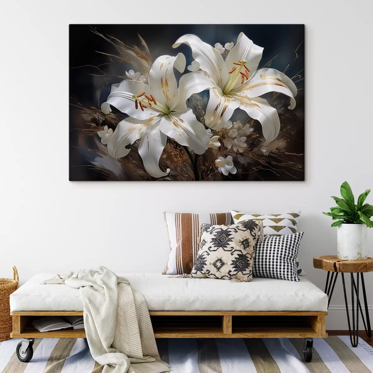 Obraz Kwiaty lilii na ciemnym tle z elementami dekoracyjnymi Nr s44848