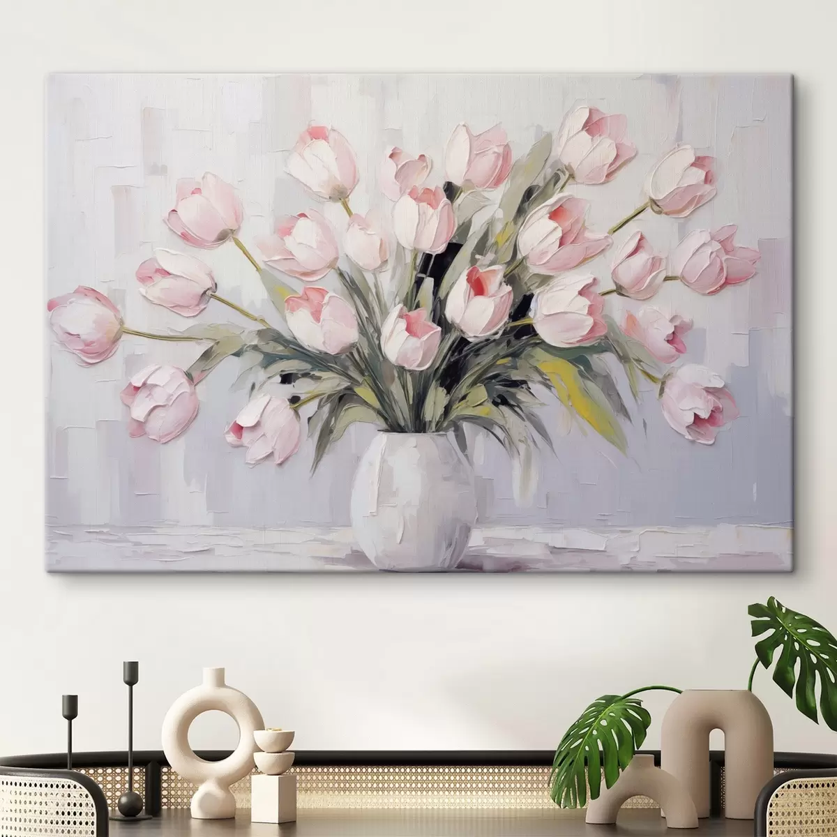 Obraz Wazon z różowymi tulipanami, zielone liście, jasnoszare tło, styl malarstwa olejnego, grube pociągnięcia pędzla  s44852