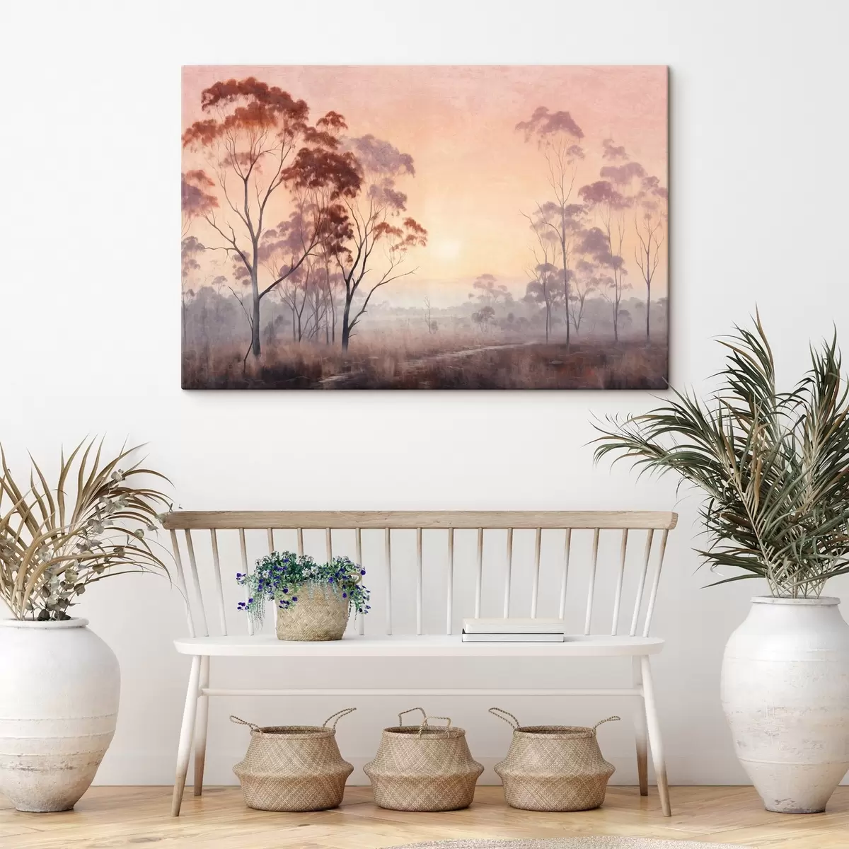 Obraz Pejzaż przedstawiający pole z wysoką trawą i drzewami, w tle słońce s44854