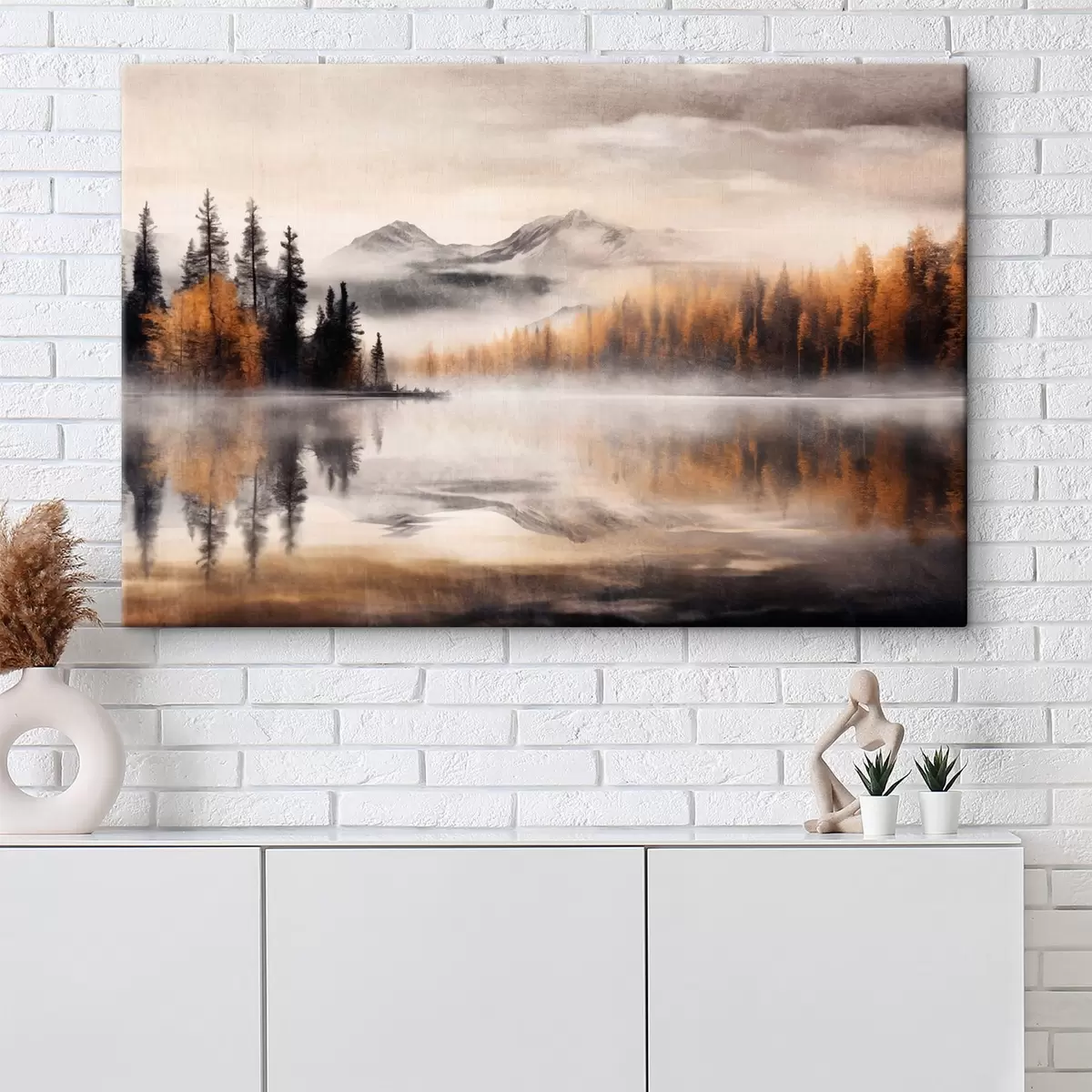 Obraz Zamglony, teksturowany krajobraz jeziora z sosnami i górami, zachmurzone szare niebo  s44856