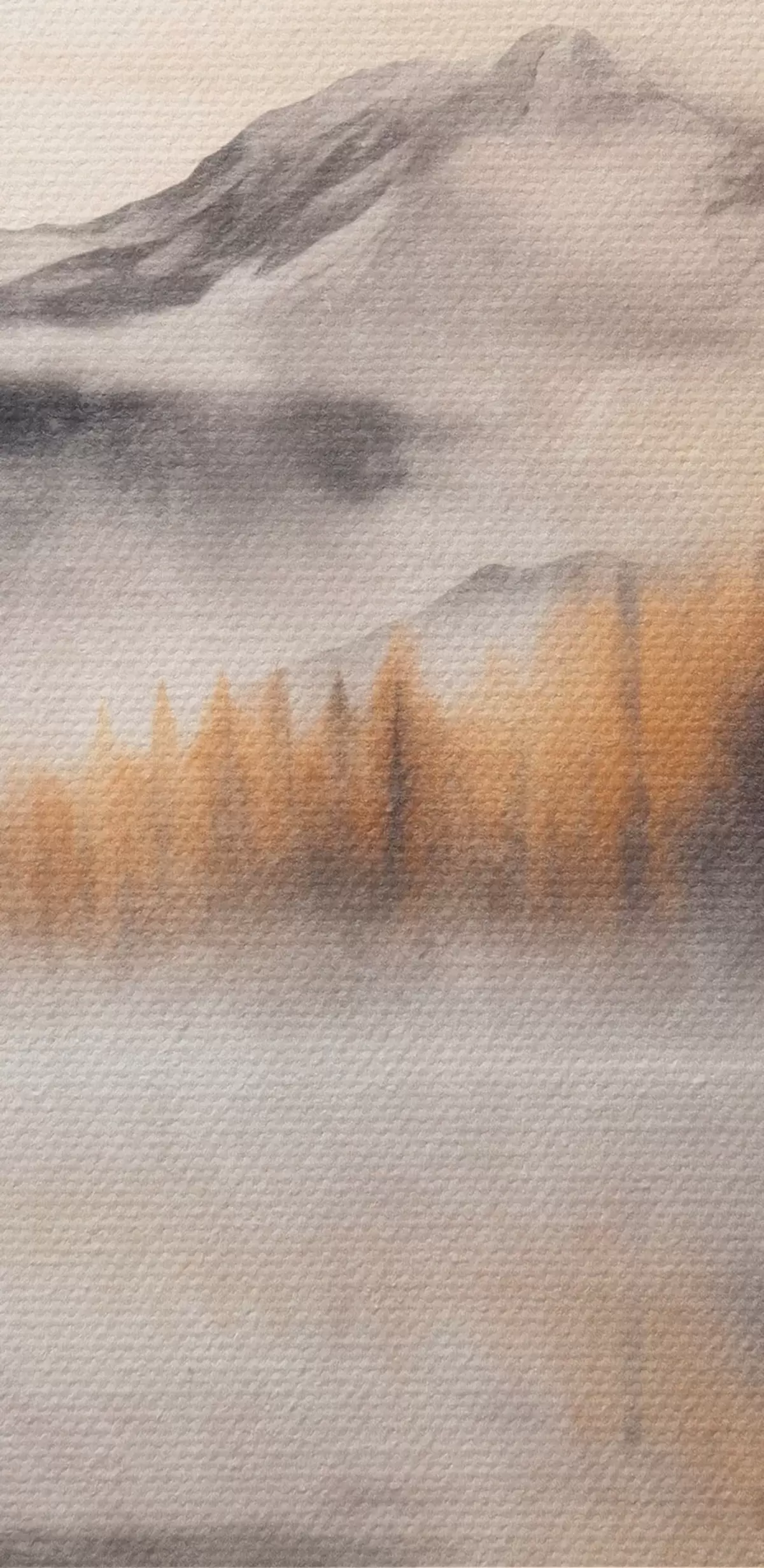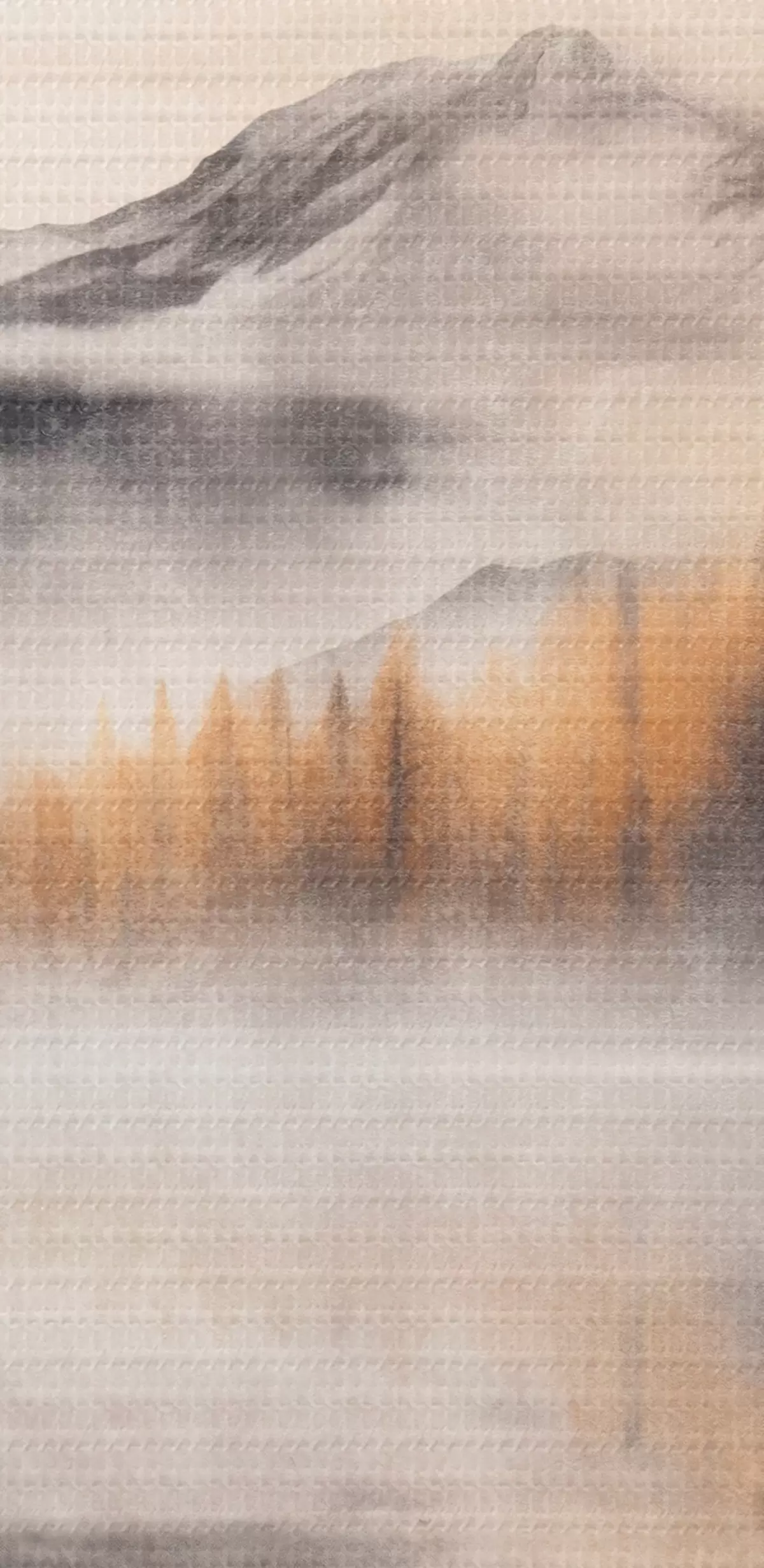 Obraz Zamglony, teksturowany krajobraz jeziora z sosnami i górami, zachmurzone szare niebo Nr s44856