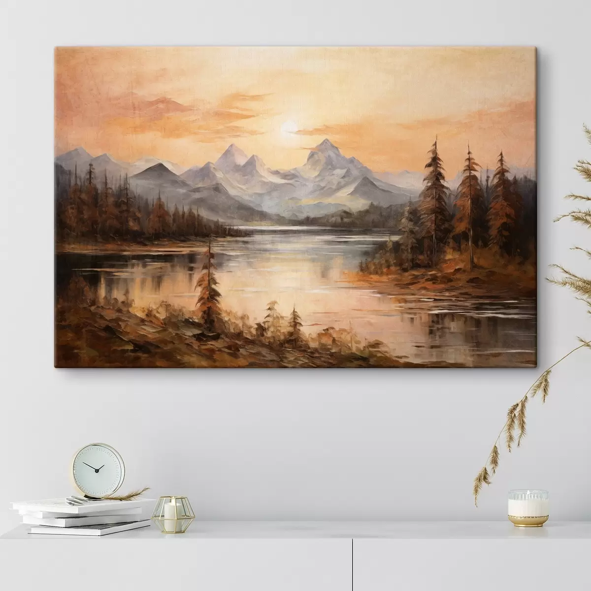 Obraz Krajobraz z jeziorem otoczonym drzewami i górami w tle, pomarańczowe niebo ze słońcem Nr s44857