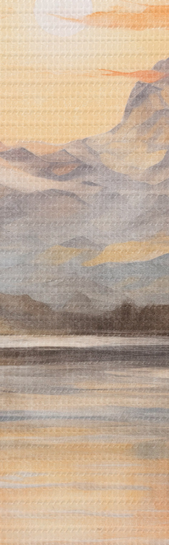 Obraz Krajobraz z jeziorem otoczonym drzewami i górami w tle, pomarańczowe niebo ze słońcem  s44857