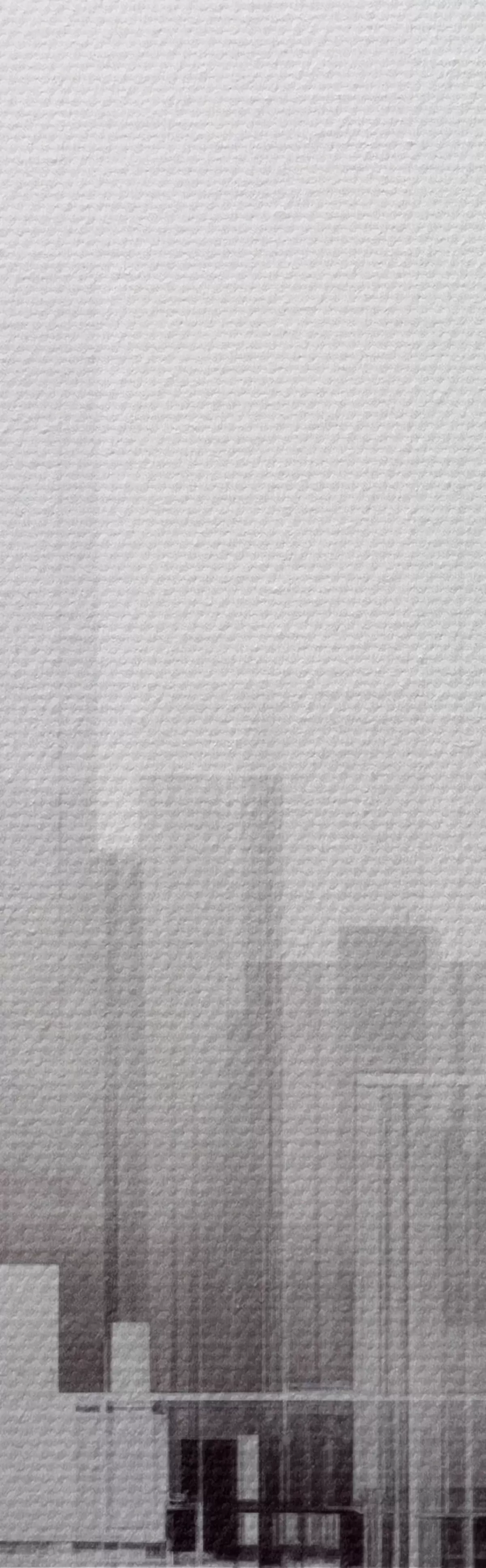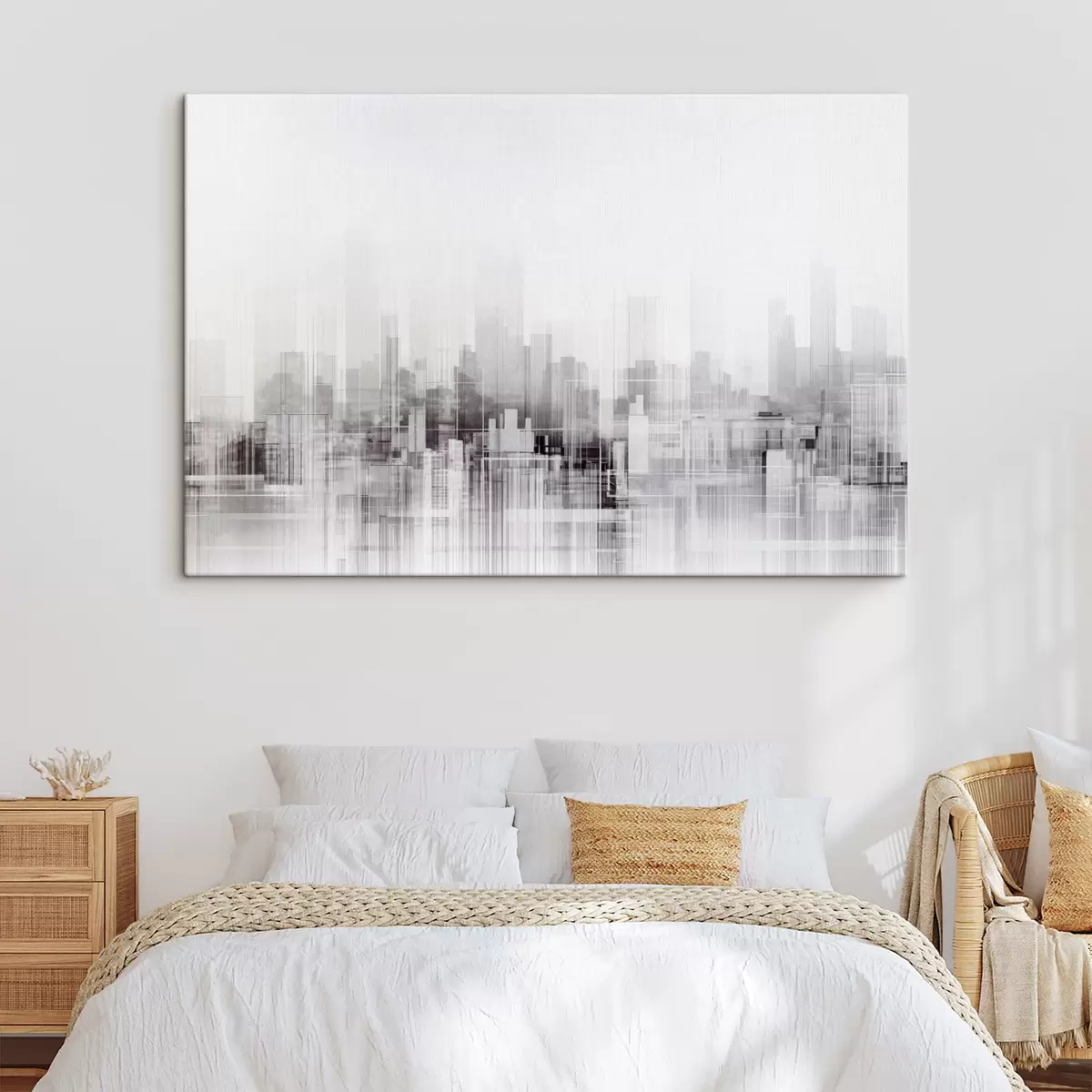 Obraz Teksturowany minimalistyczny pejzaż miejski z wysokimi budynkami i drapaczami chmur na tle białego nieba Nr s44863