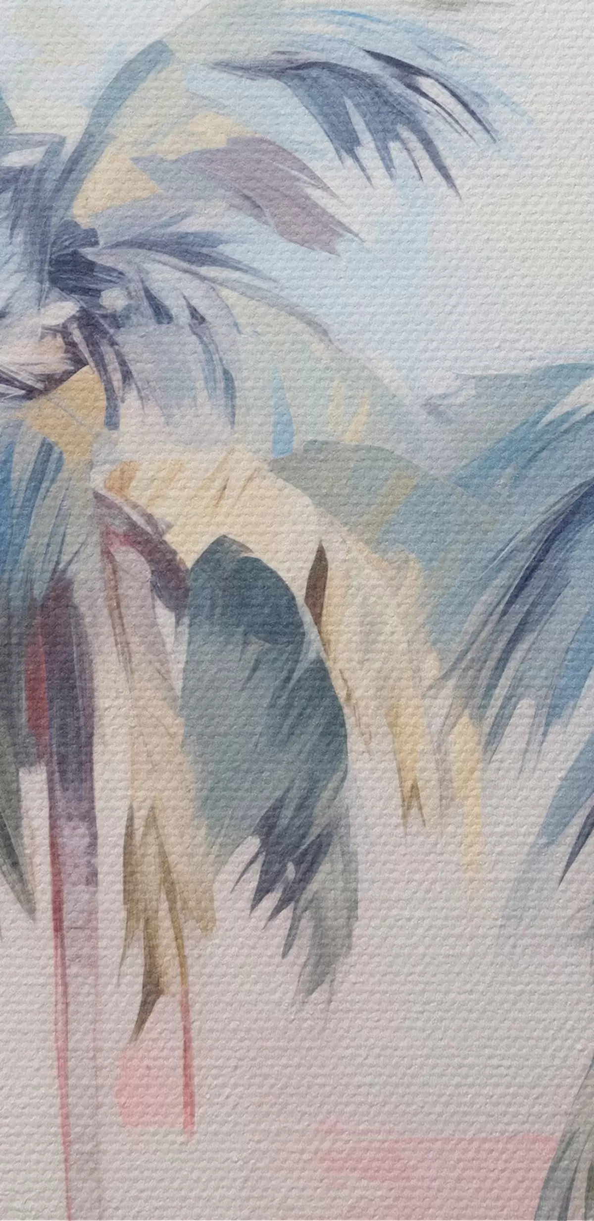 Obraz Palmy z pastelowymi liśćmi i brązowymi pniami, różowe i niebieskie niebo, tropikalne otoczenie Nr s44866
