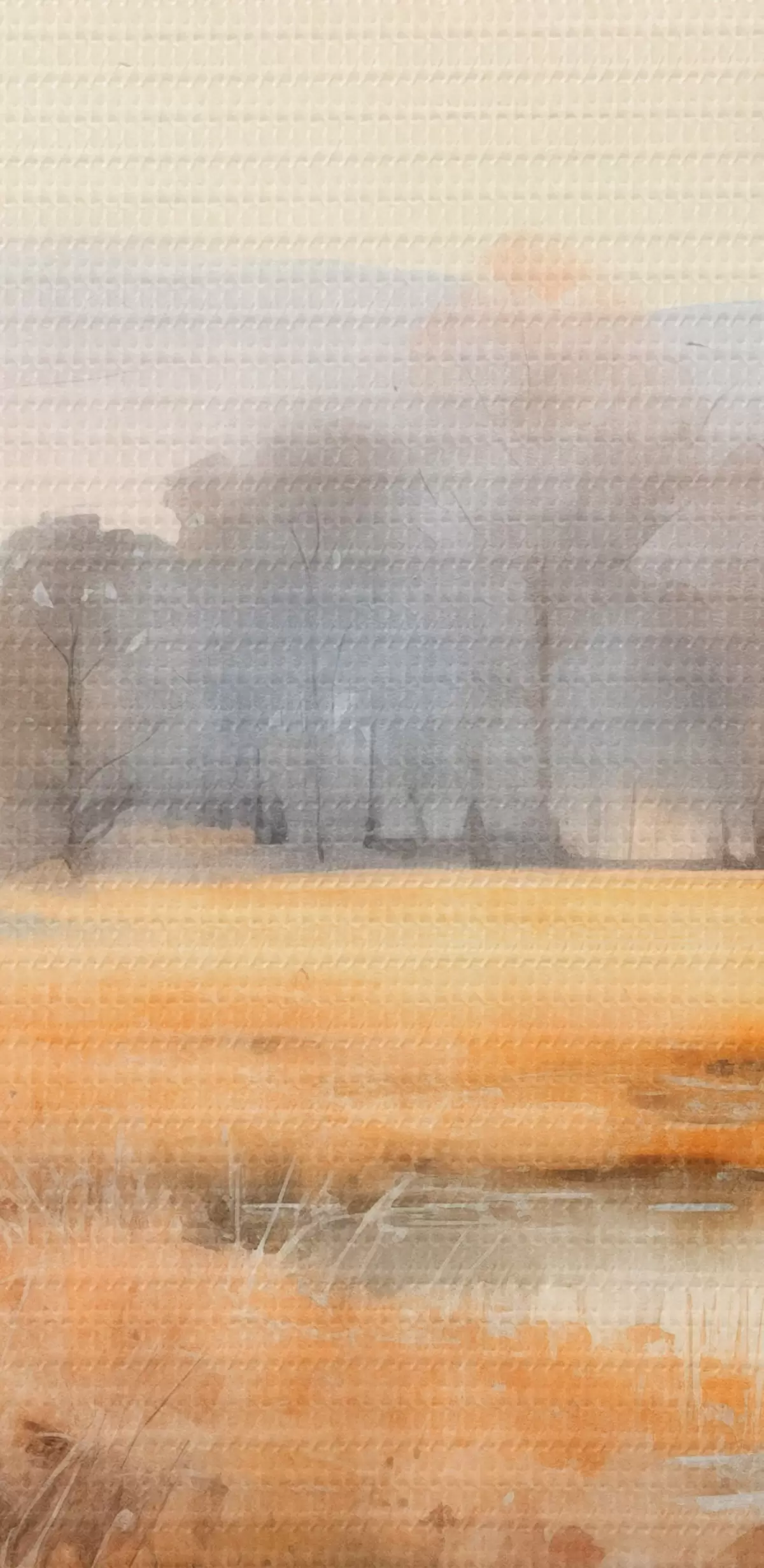 Obraz Spokojny, teksturowany pejzaż imitujący trzciny i nagie drzewa, spokojna woda pod niebem Nr s44867