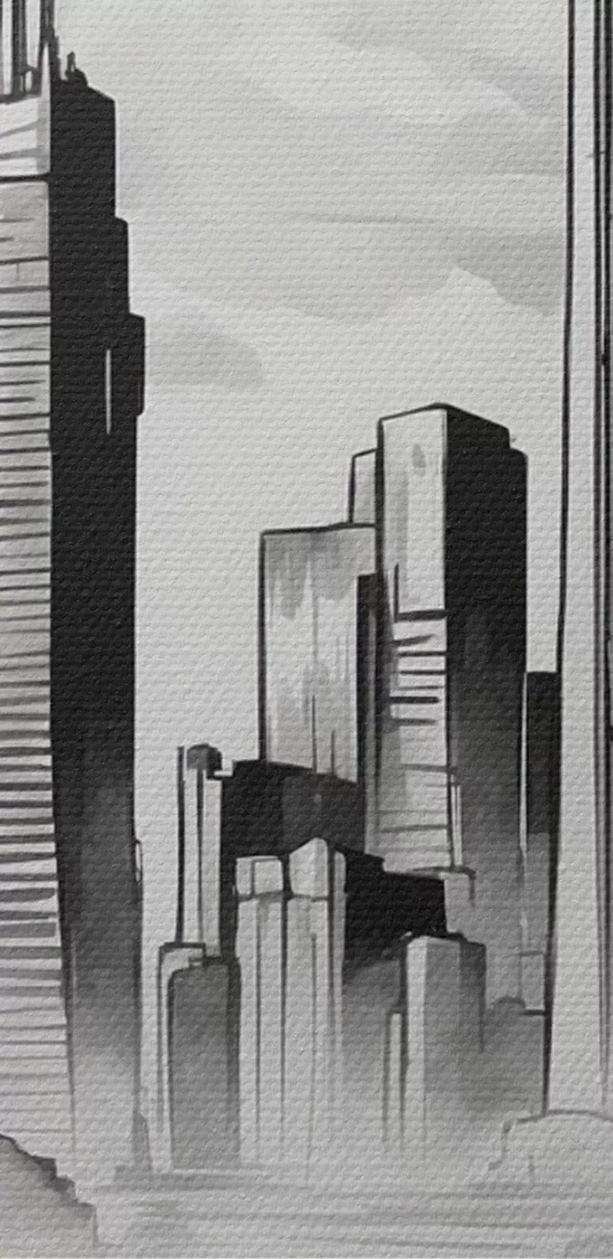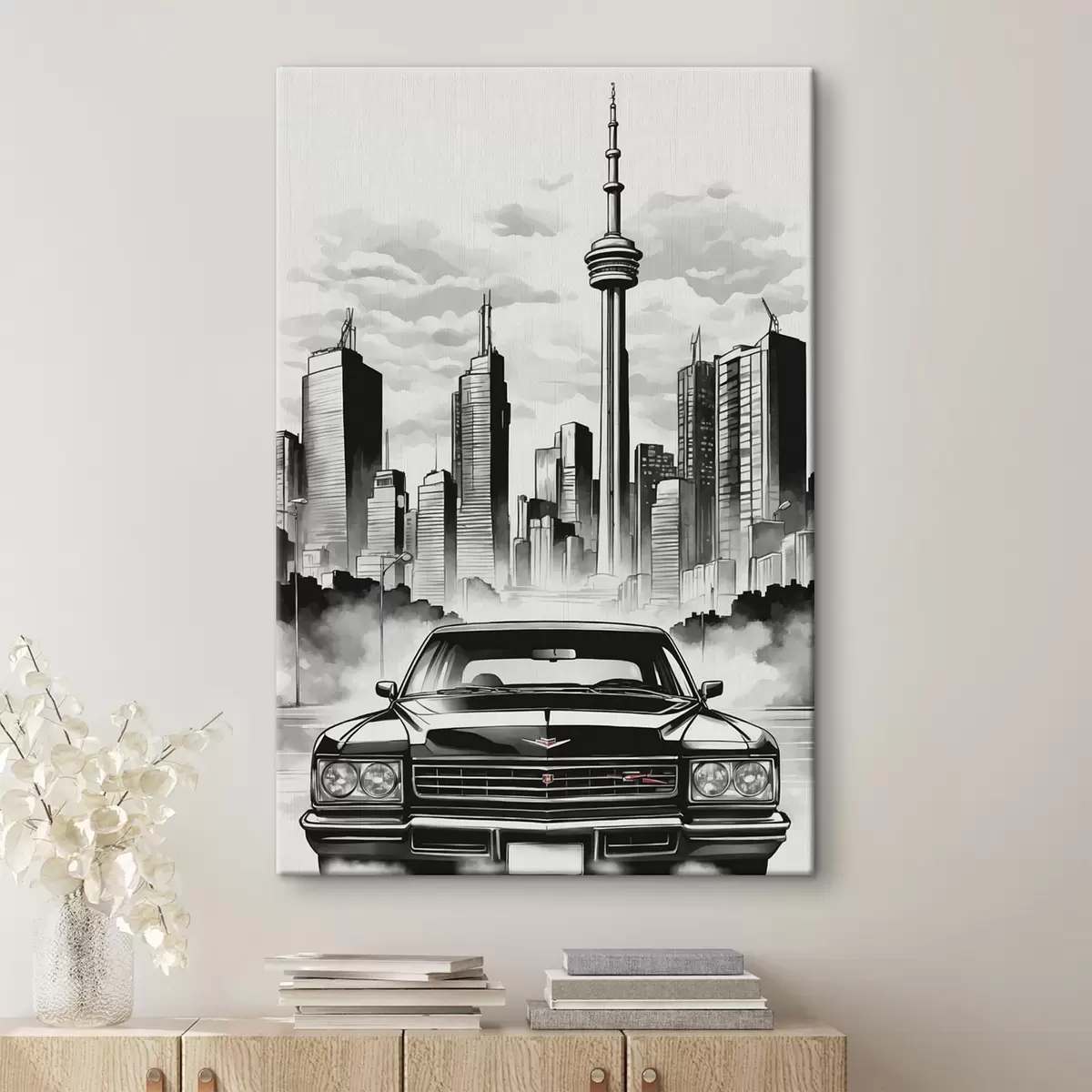 Obraz Samochód retro na tle monochromatycznego miasta z drapaczami chmur Nr s44871