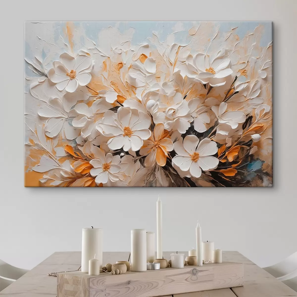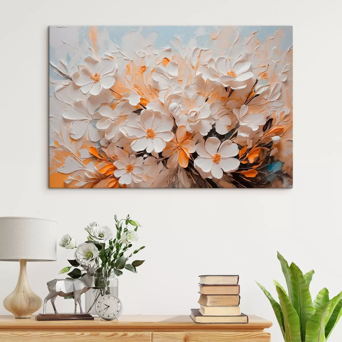 Obraz Białe i brzoskwiniowe kwiaty na niebieskim tle z pastelami Nr s44879
