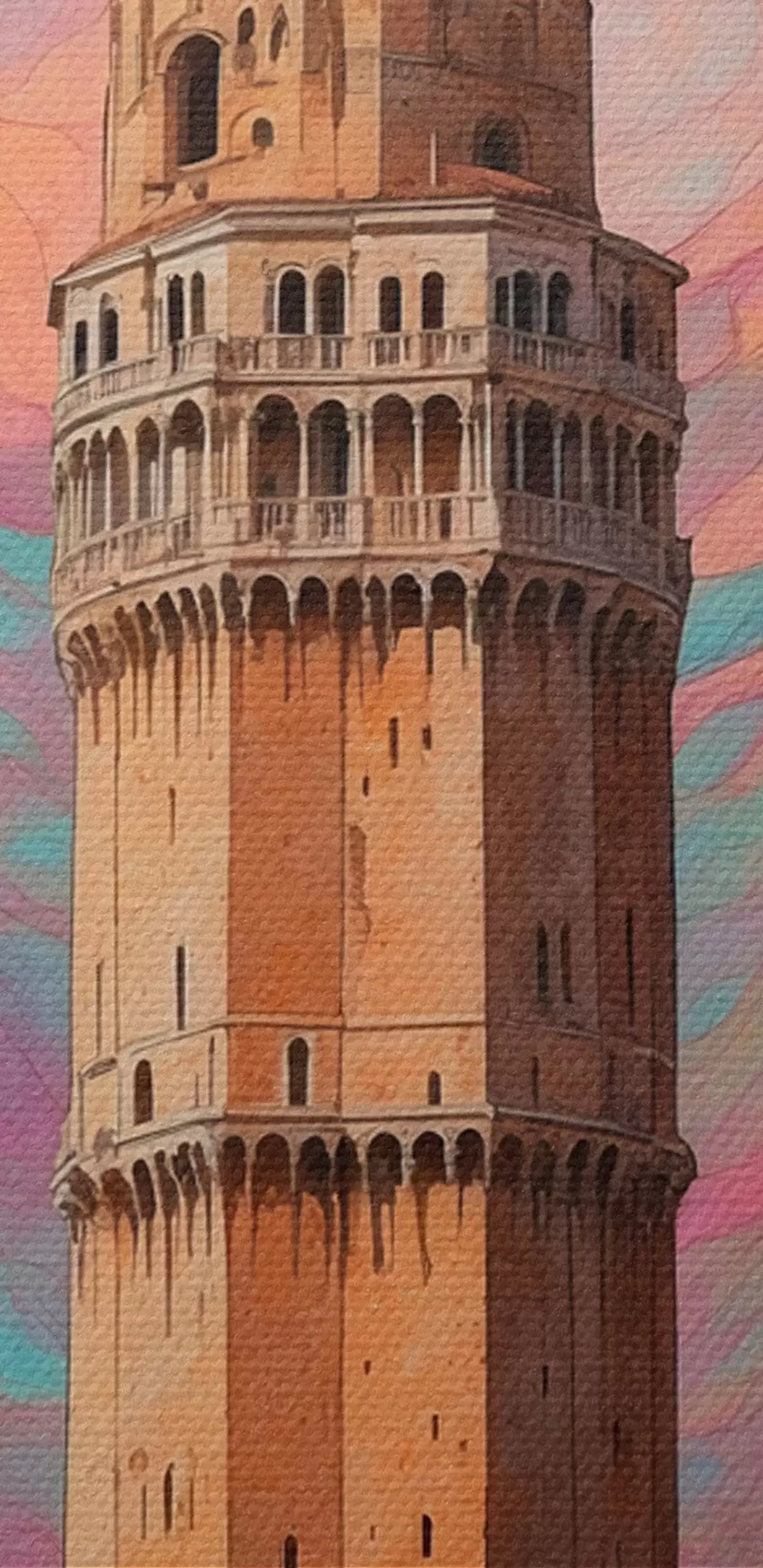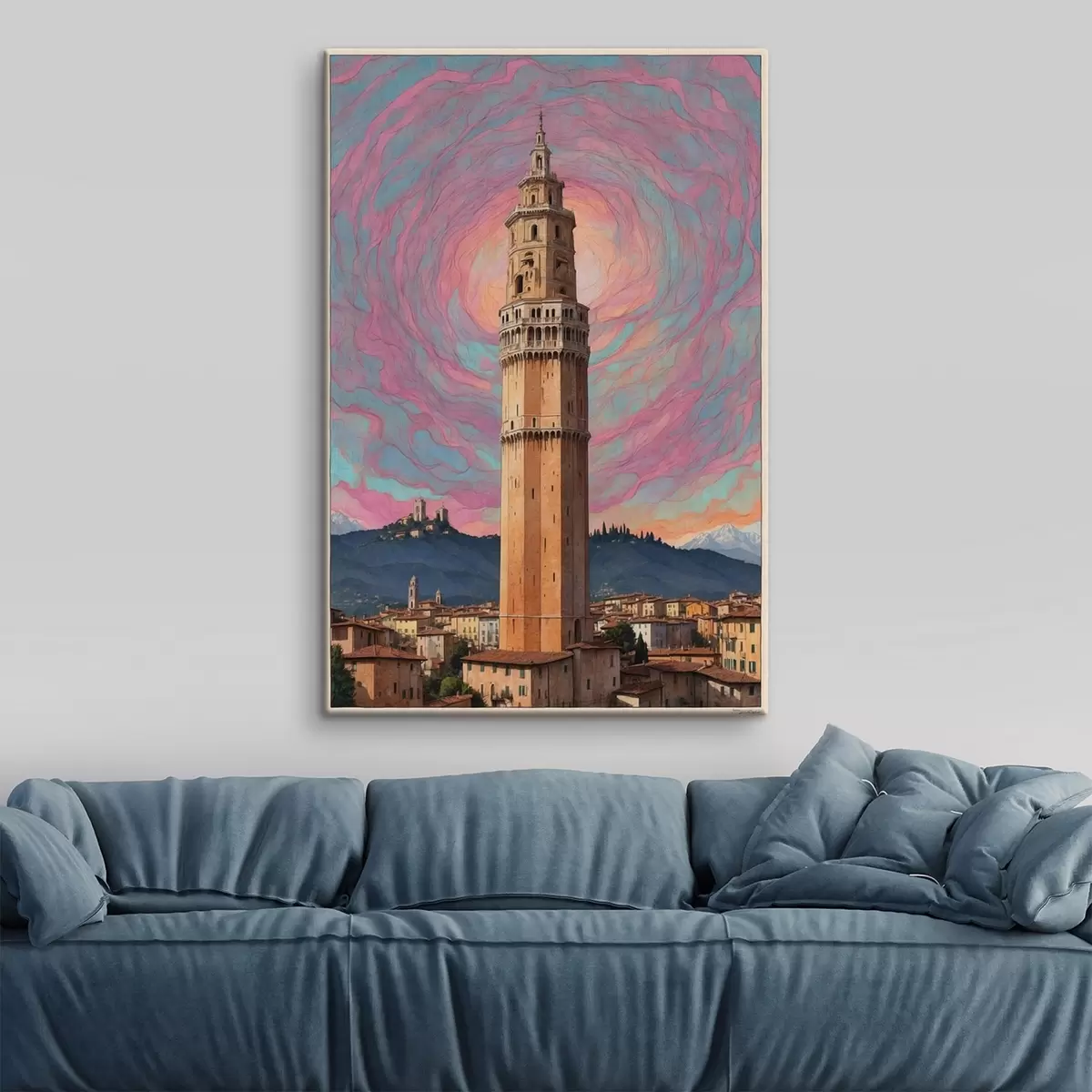 Obraz Fantazyjna wieża na tle nieba z różowymi i niebieskimi spiralami Nr s44885