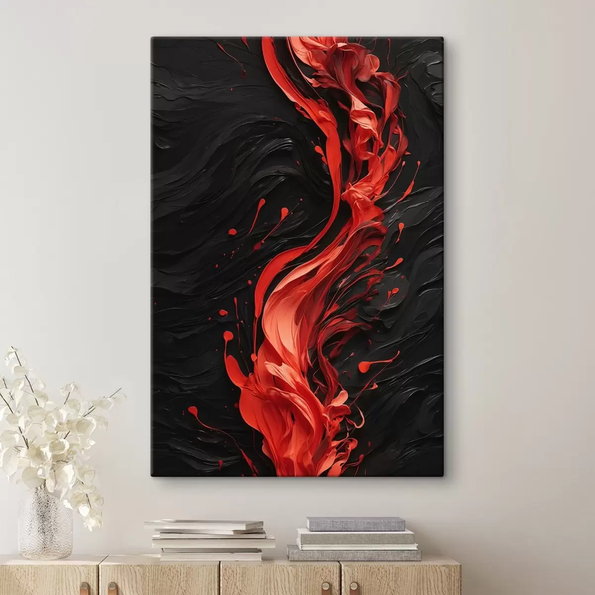 Obraz Strumień czerwonej farby na czarnym abstrakcyjnym tle Nr s44889