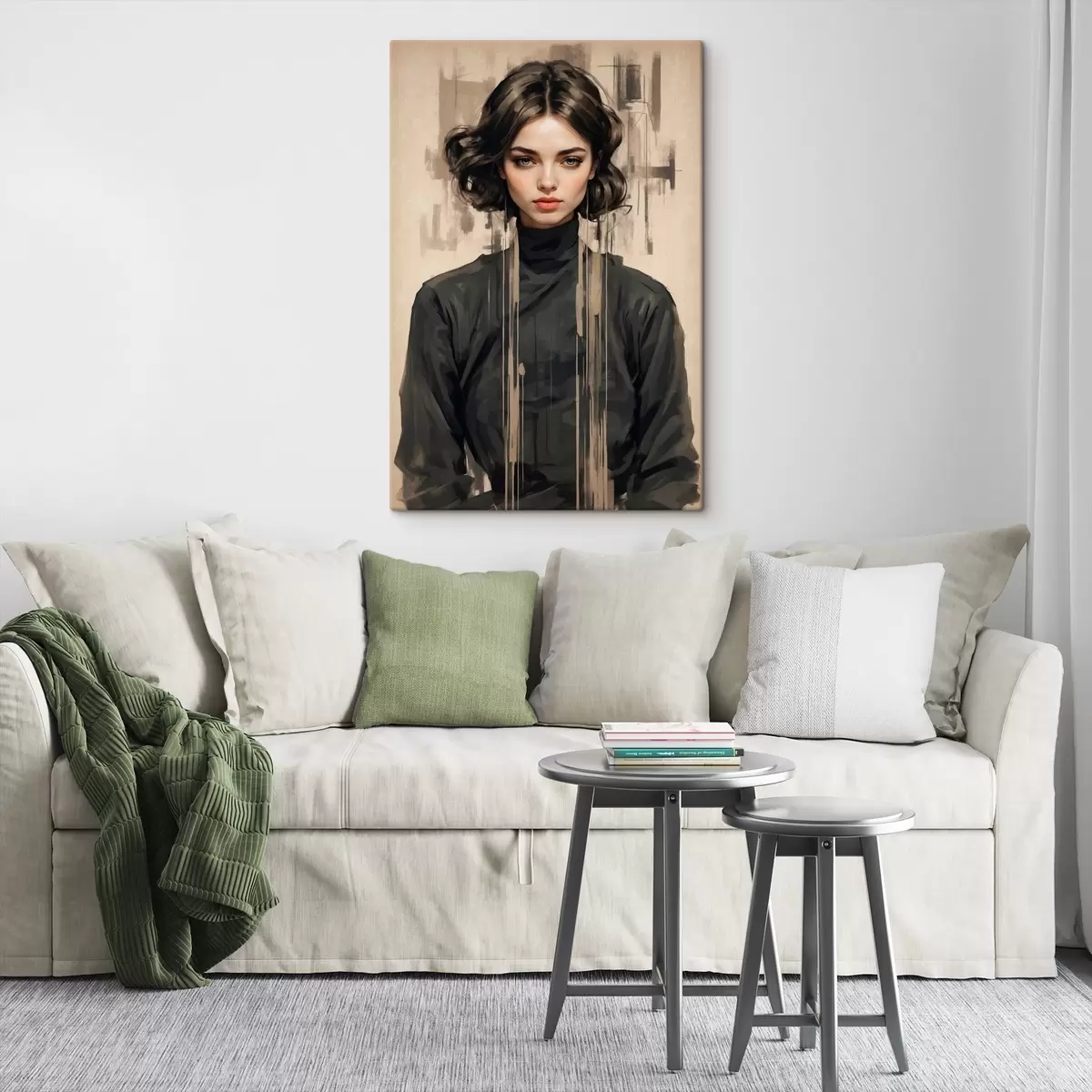 Obraz Portret kobiety z krótkimi ciemnymi włosami na abstrakcyjnym tle Nr s44890
