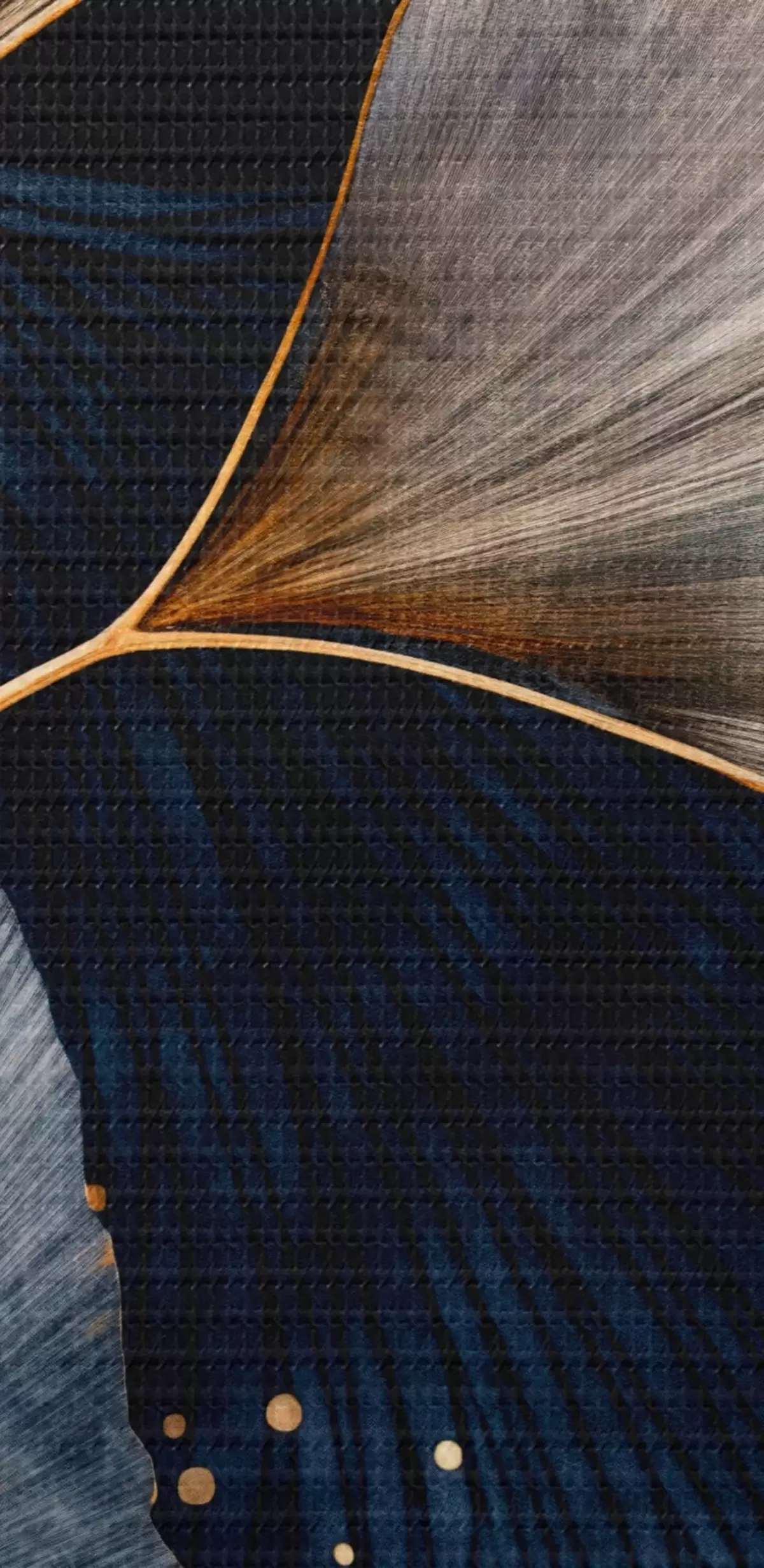 Obraz Liście miłorzębu w żółtych i niebieskich odcieniach, eleganckie ciemne tło, sztuka nowoczesna, styl minimalistyczny, inspirowany naturą Nr s44921