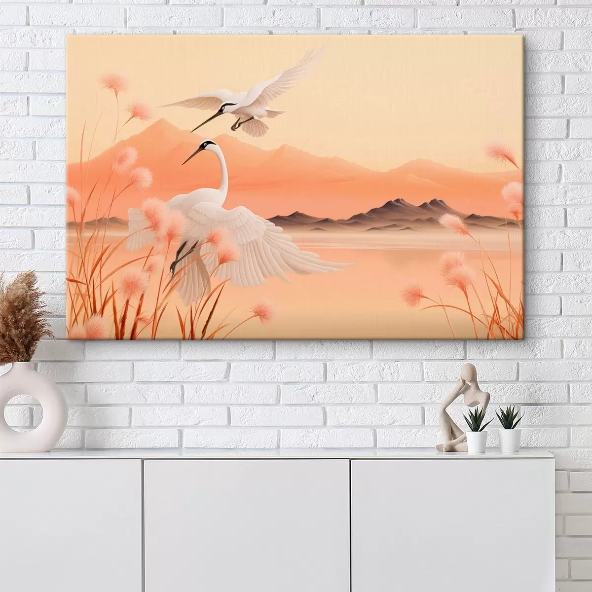 Obraz Białe żurawie z różowymi trzcinami na pierwszym planie, góry i jezioro w tle, miękkie pomarańczowe światło s44925