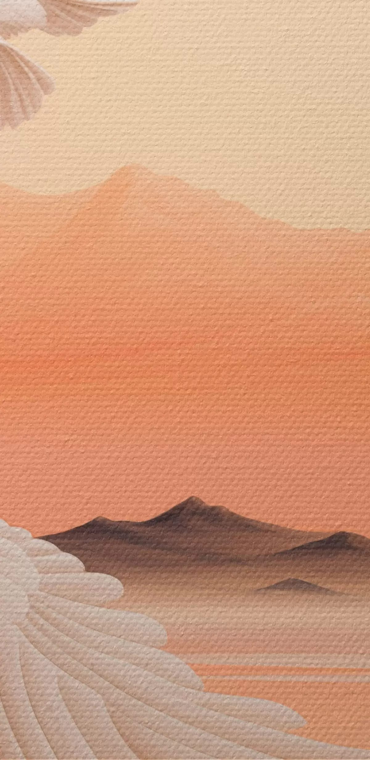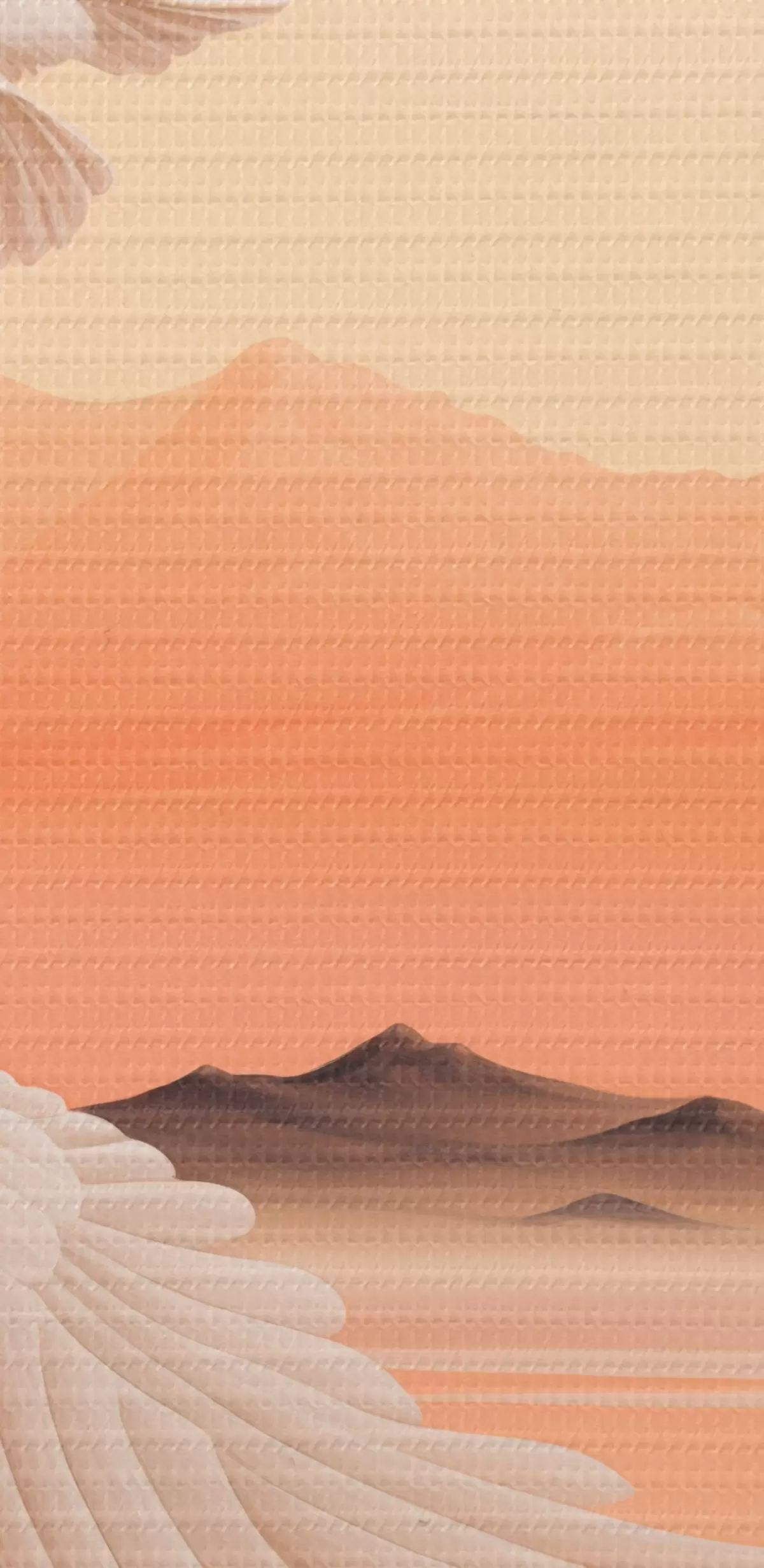 Obraz Białe żurawie z różowymi trzcinami na pierwszym planie, góry i jezioro w tle, miękkie pomarańczowe światło Nr s44925