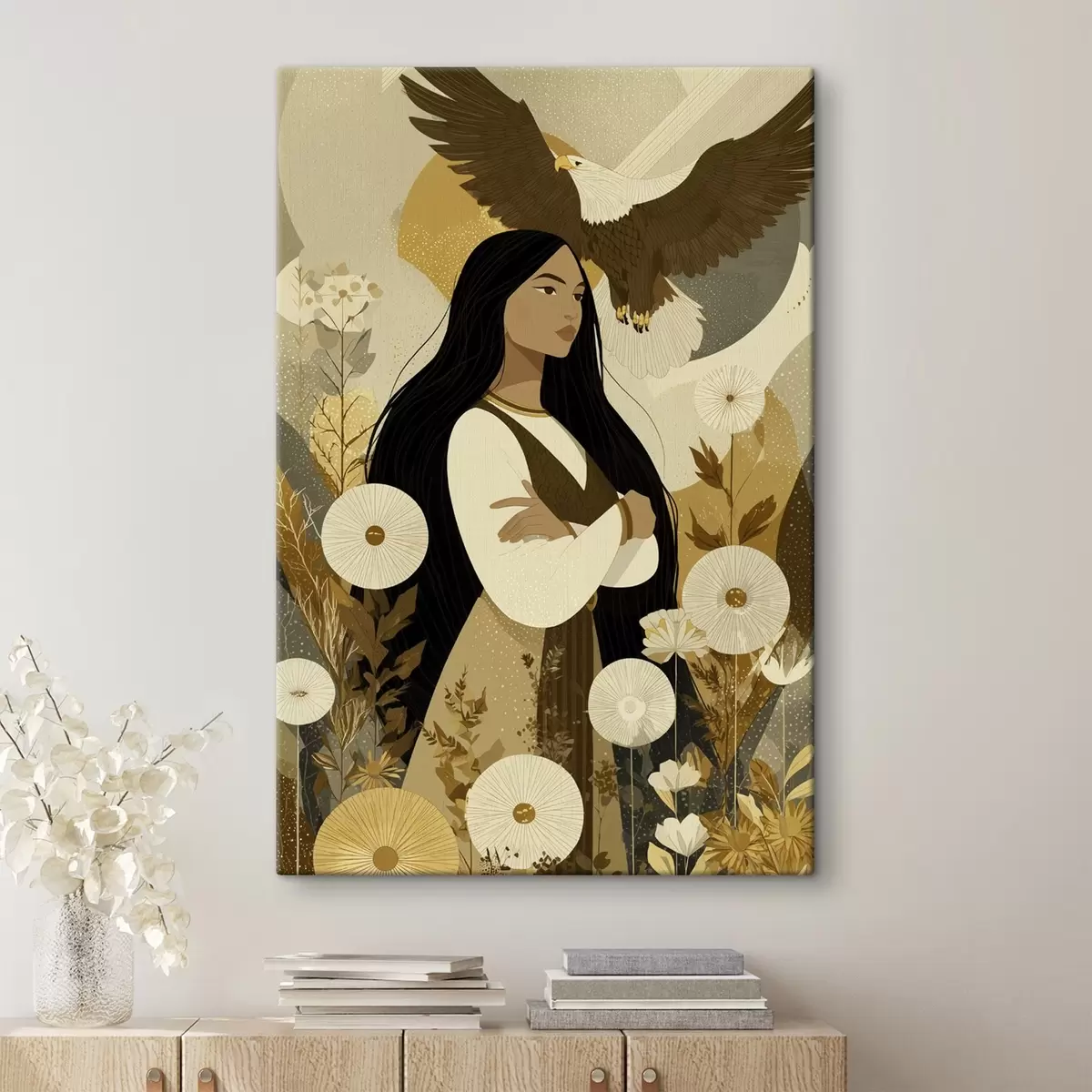 Obraz Kobieta z latającym orłem, styl plemienny, beżowe kolory Nr s44977