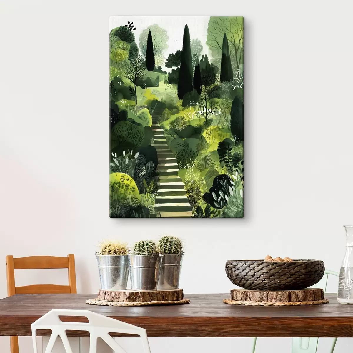 Obraz Zielone wzgórza z drzewami i krzewami, betonowe schody, soczyste kolory Nr s44980