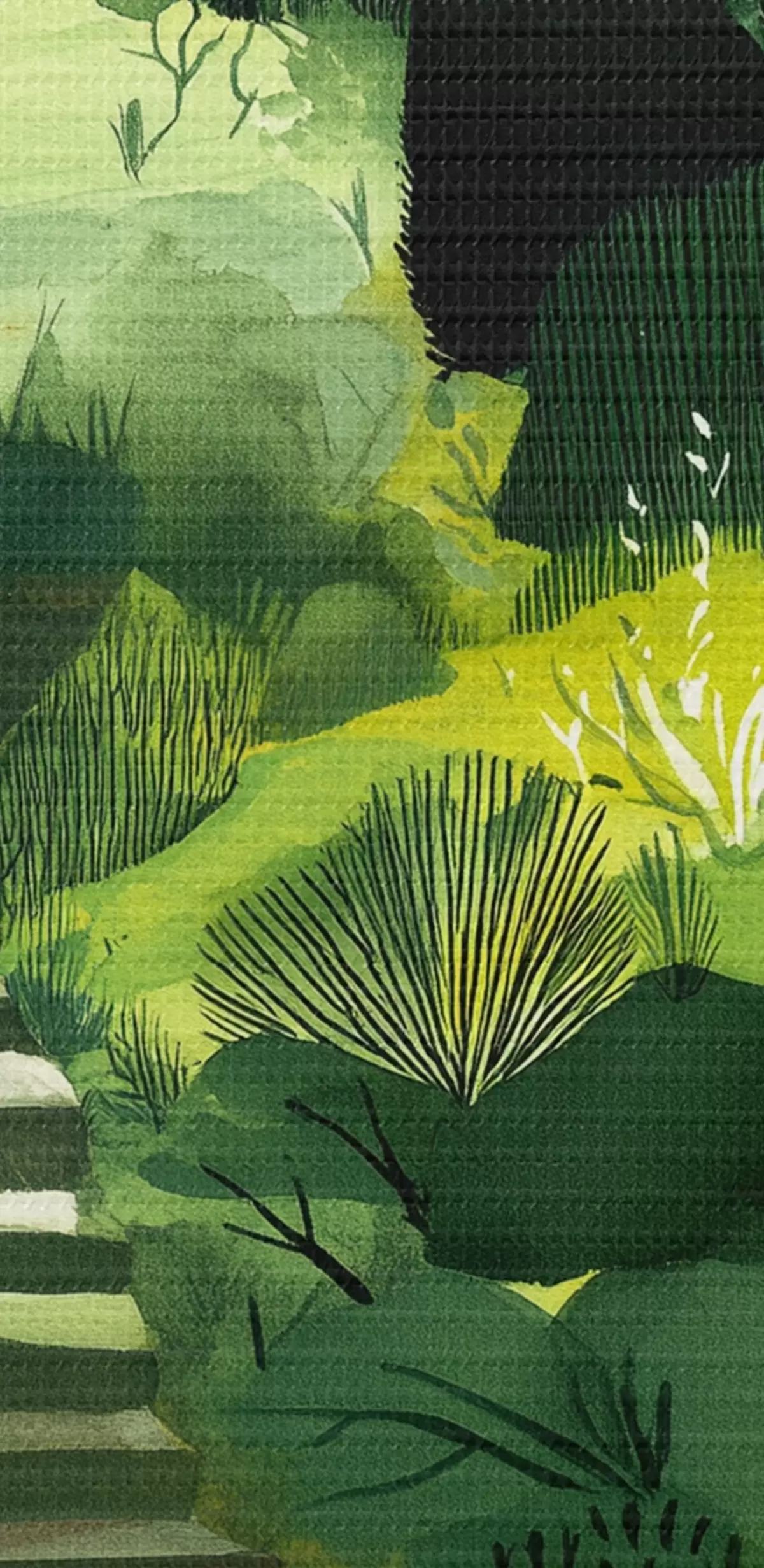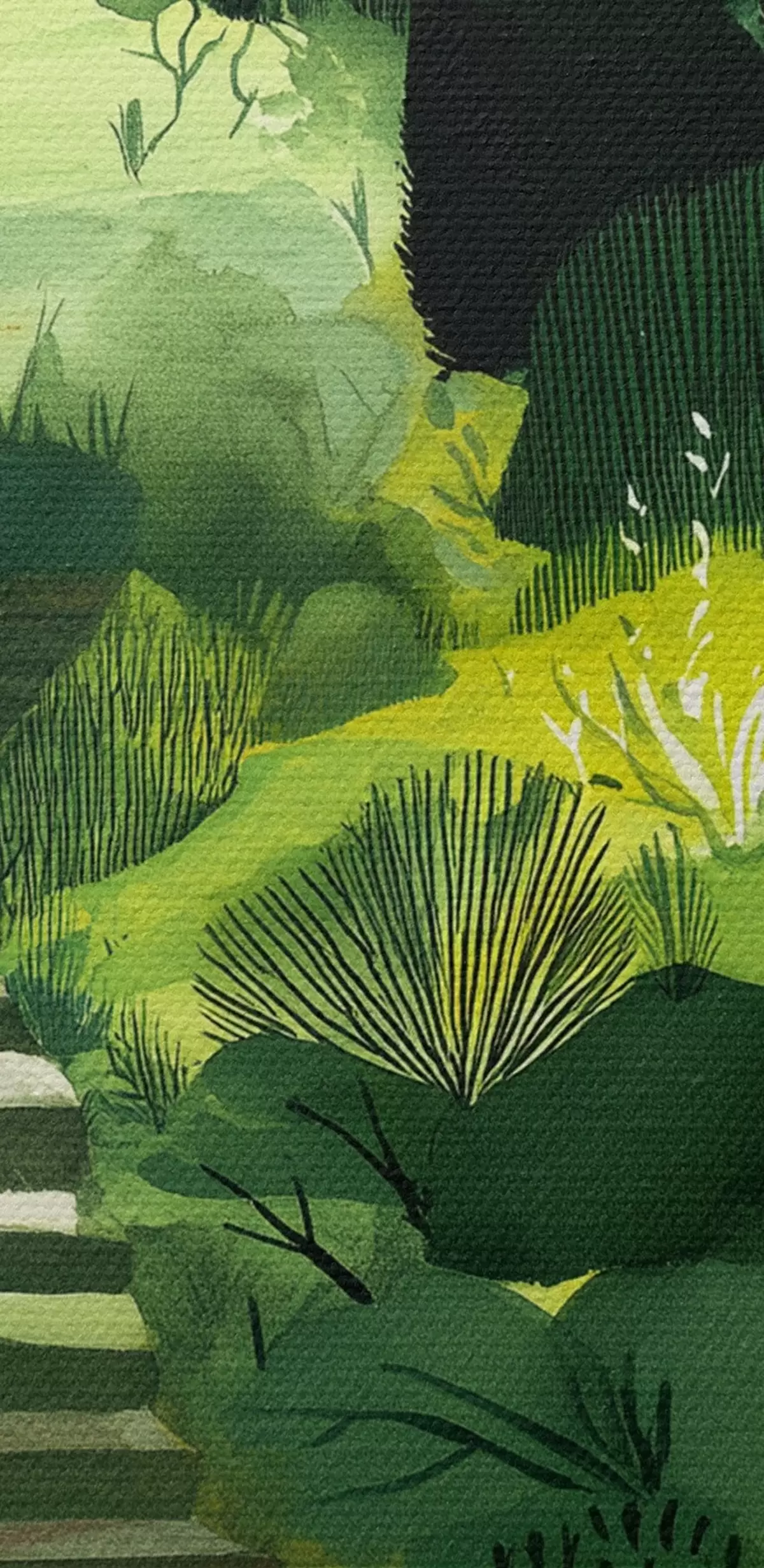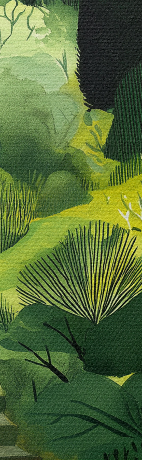 Obraz Zielone wzgórza z drzewami i krzewami, betonowe schody, soczyste kolory s44980