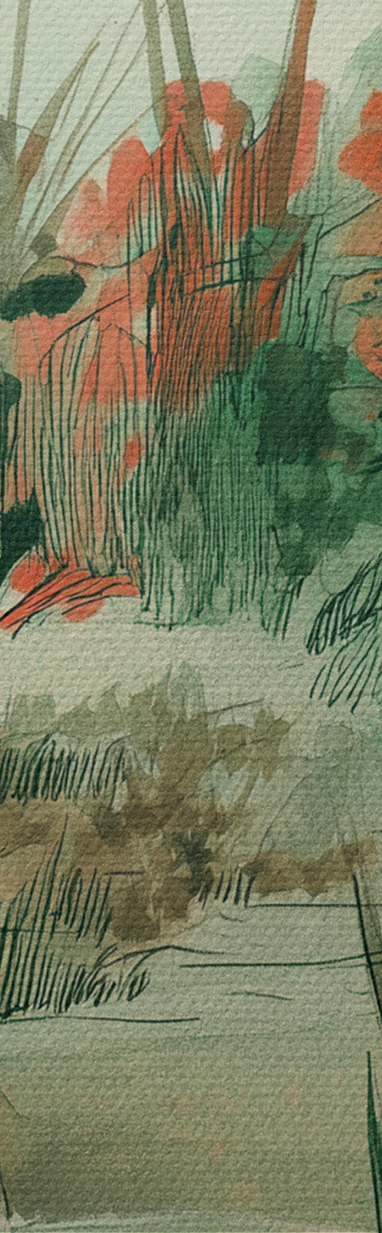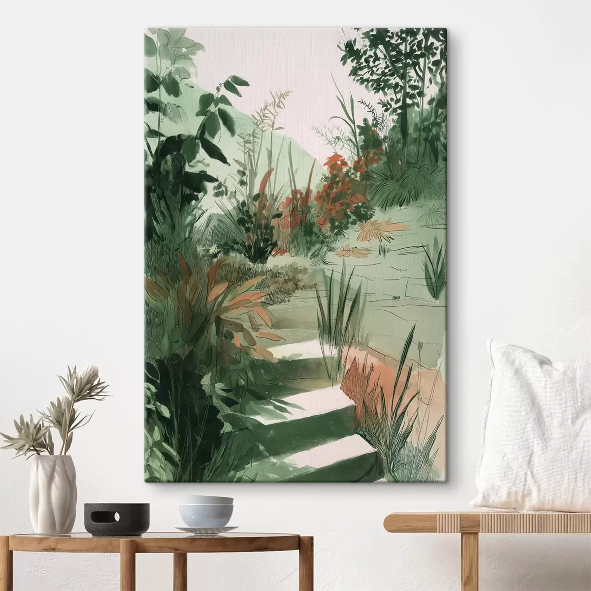 Obraz Orientalny ogród z krzewami i drzewami, zielone kolory Nr s44982