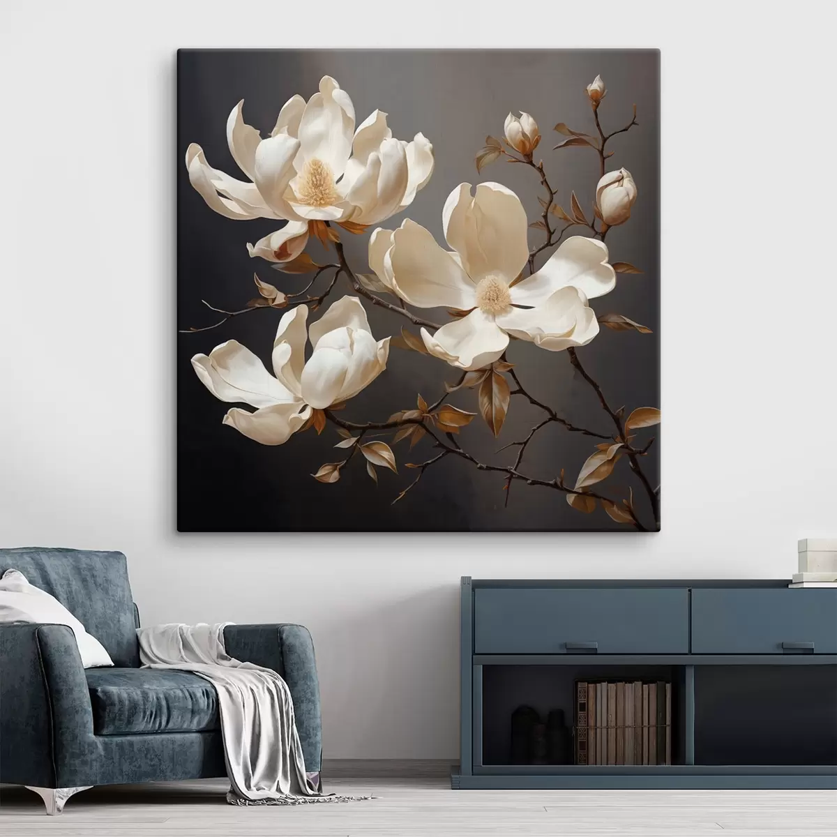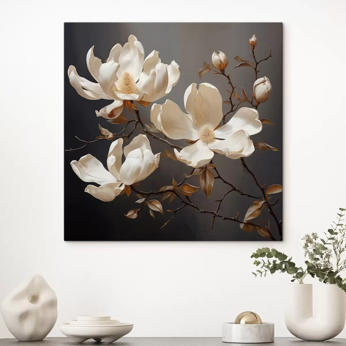 Obraz Białe magnolie na ciemnym tle w malarskim stylu Nr s45038