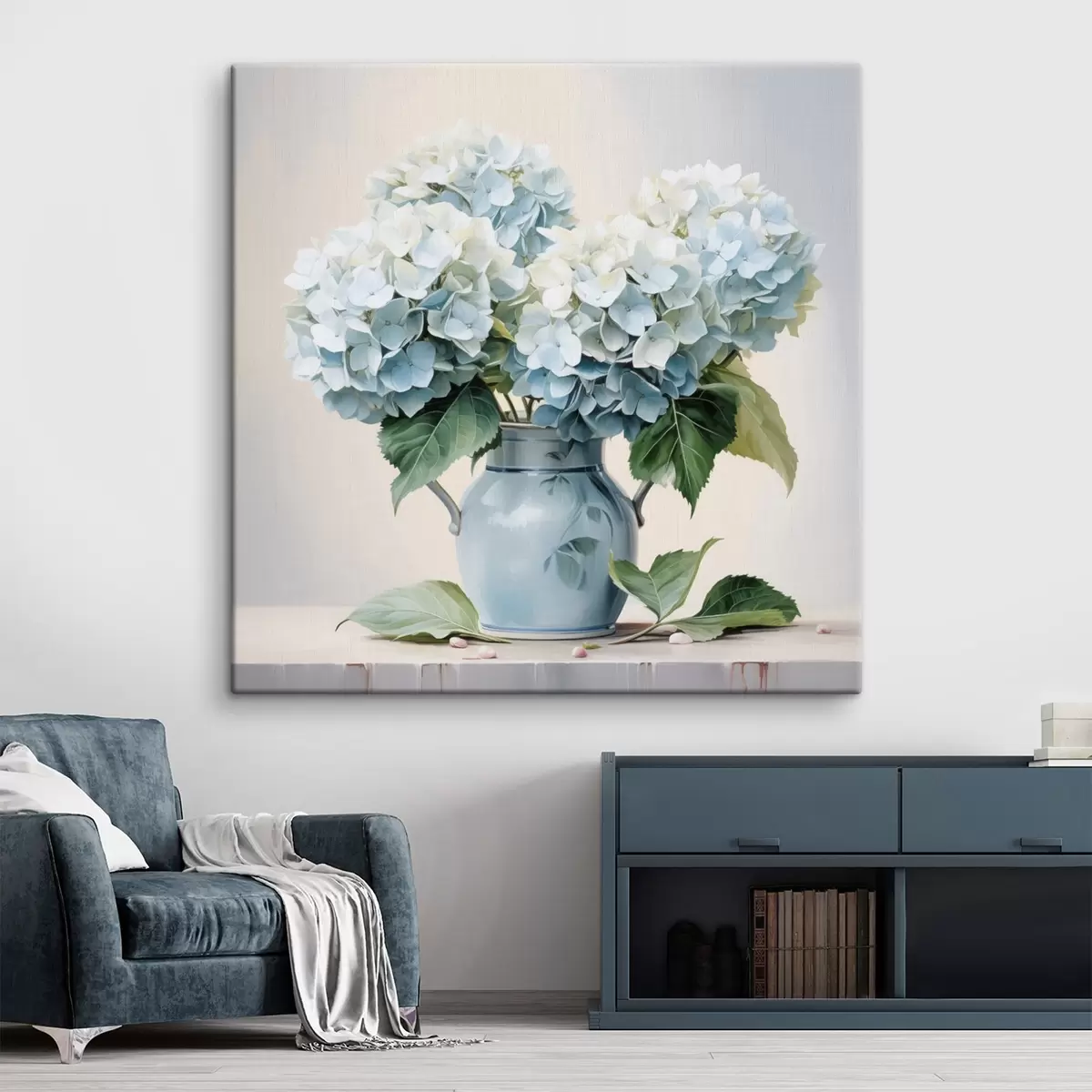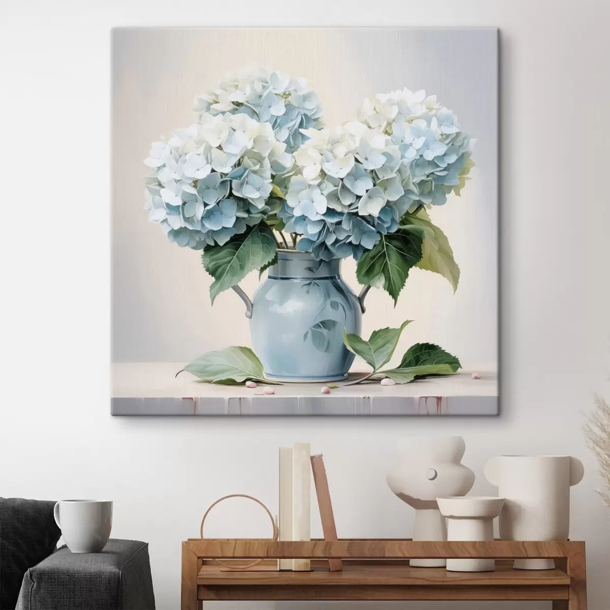 Obraz Świeże hortensje w niebieskim wazonie na jasnym tle Nr s45043